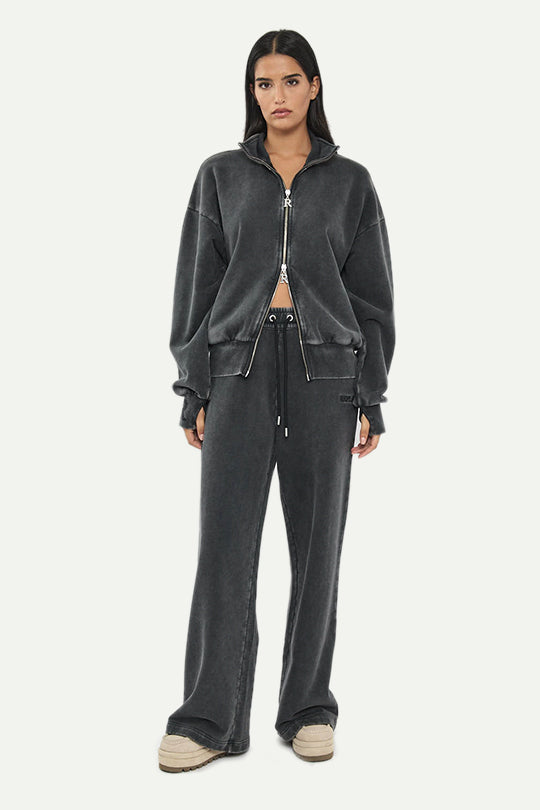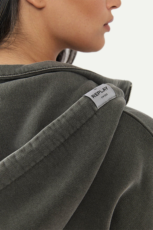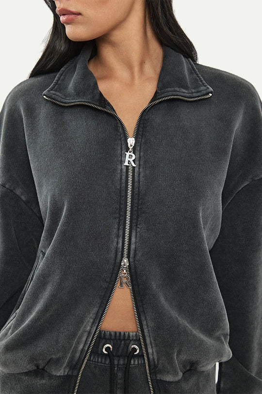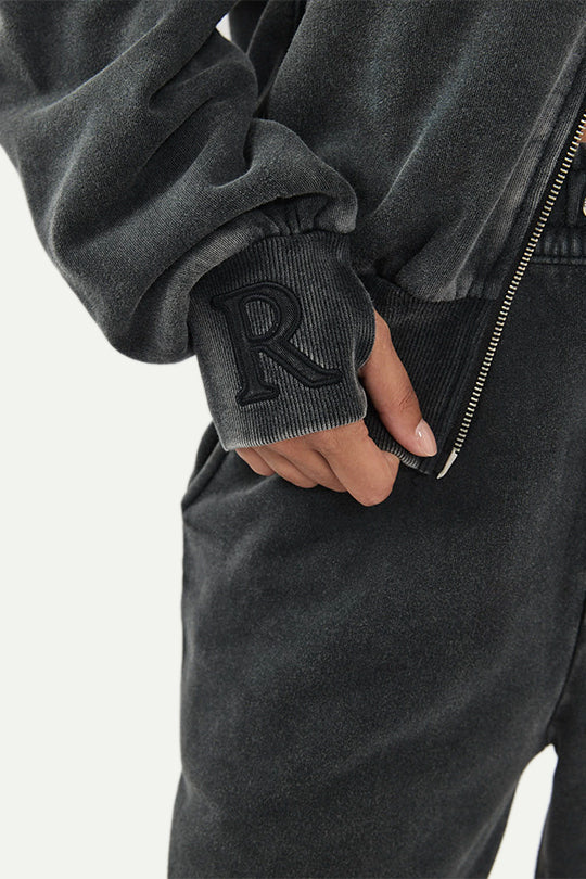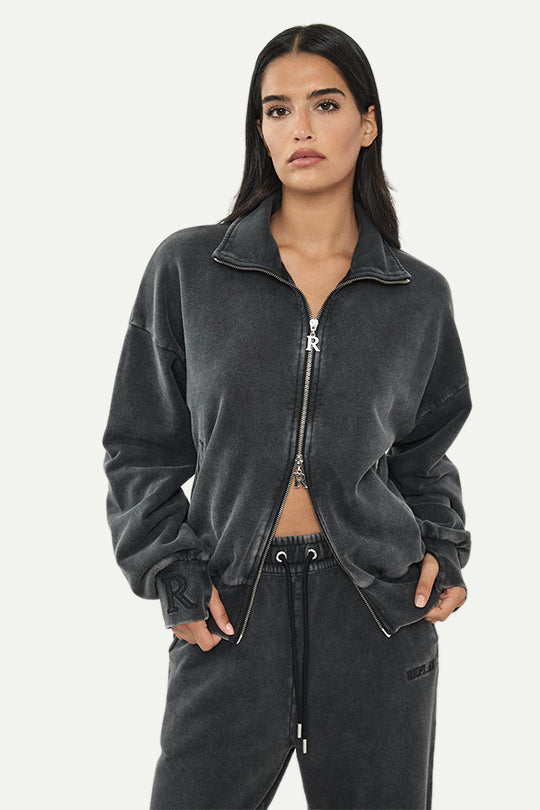 סווטשירט לנשים בגוון שחור במראה וינטג’ שטוף, עם רוכסן קדמי מלא ותליון R ממותג, צווארון גבוה וכיסי צד נוחים. עשויה מבד טרי כותנה רך ונעים בגזרה מעט משוחררת – מושלמת ליומיום, לשכבות ולסט תואם עם מכנסי טרנינג.