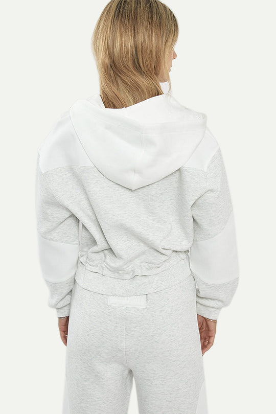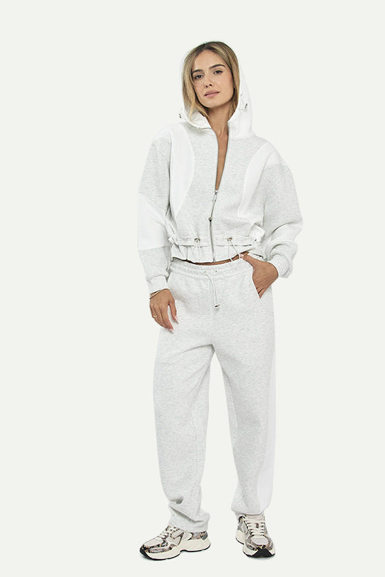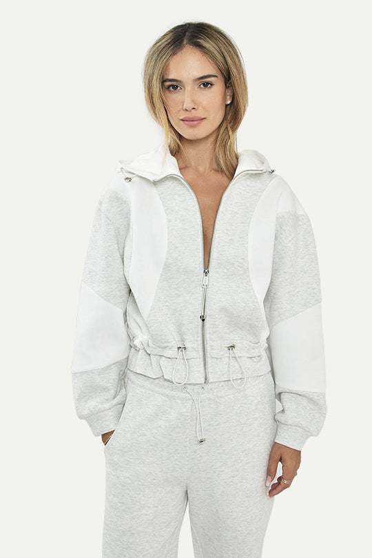 קפוצ'ון נשים עם רוכסן מלא וגזרה נוחה ביומיום. פאנלים לבנים בחזה ובשרוולים מעניקים מראה מודרני ונקי, וקו מותן עם שרוך כיווץ מאפשר התאמה אישית. קפוצ'ון מלא להגנה קלה וקצוות אלסטיים לגימור מסודר—מושלם לסט ספורטיבי או למראה קז'ואל עירוני.