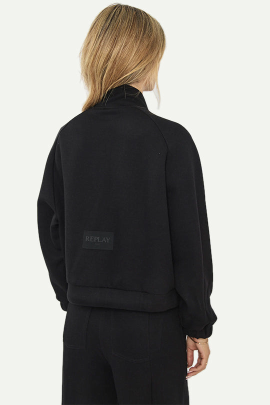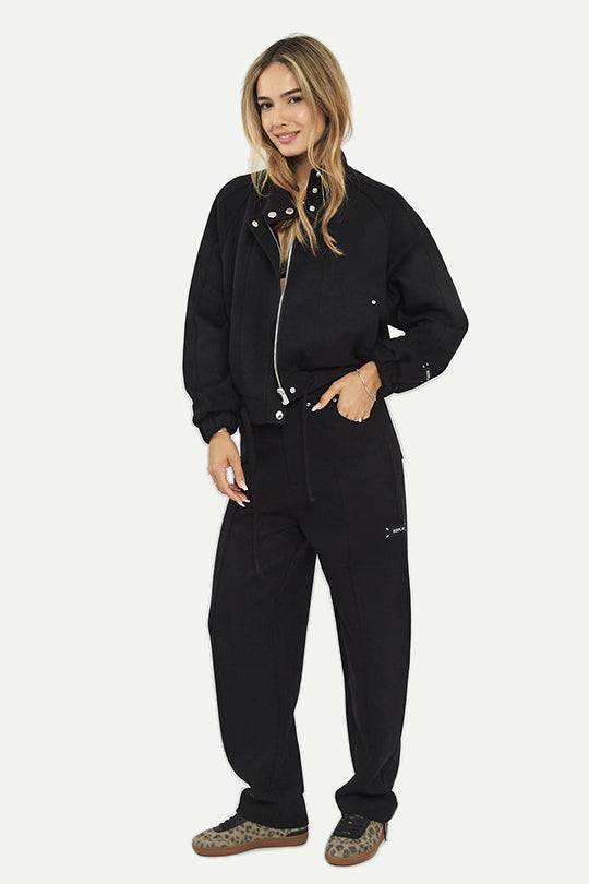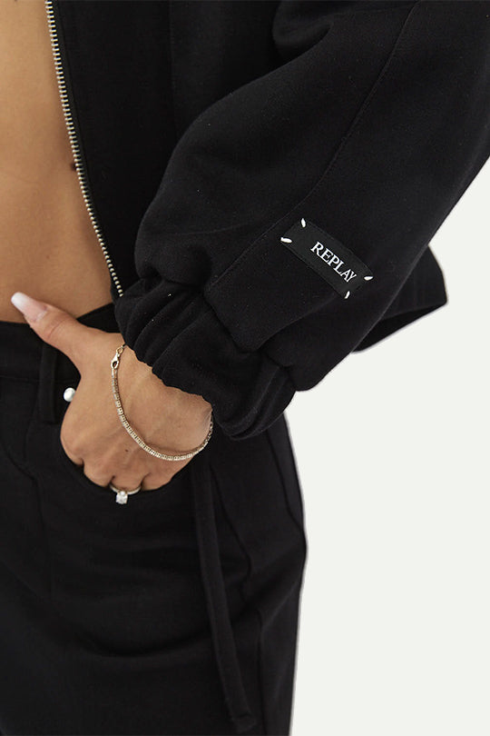 ג׳קט שחור קצר לנשים בעיצוב מודרני ואלגנטי עם רוכסן קדמי ולחצניות מתכת דקורטיביות. עשוי מבד איכותי וגמיש עם גזרה מעט רחבה ומרקם יוקרתי. השרוולים עם גומי בקצה למראה נקי ונוח, והצווארון המעוגל מוסיף טאץ' נשי ומוקפד. מושלם לשילוב מעל טופ או חולצה לבנה ללוק ערב או יומיומי מתוחכם.