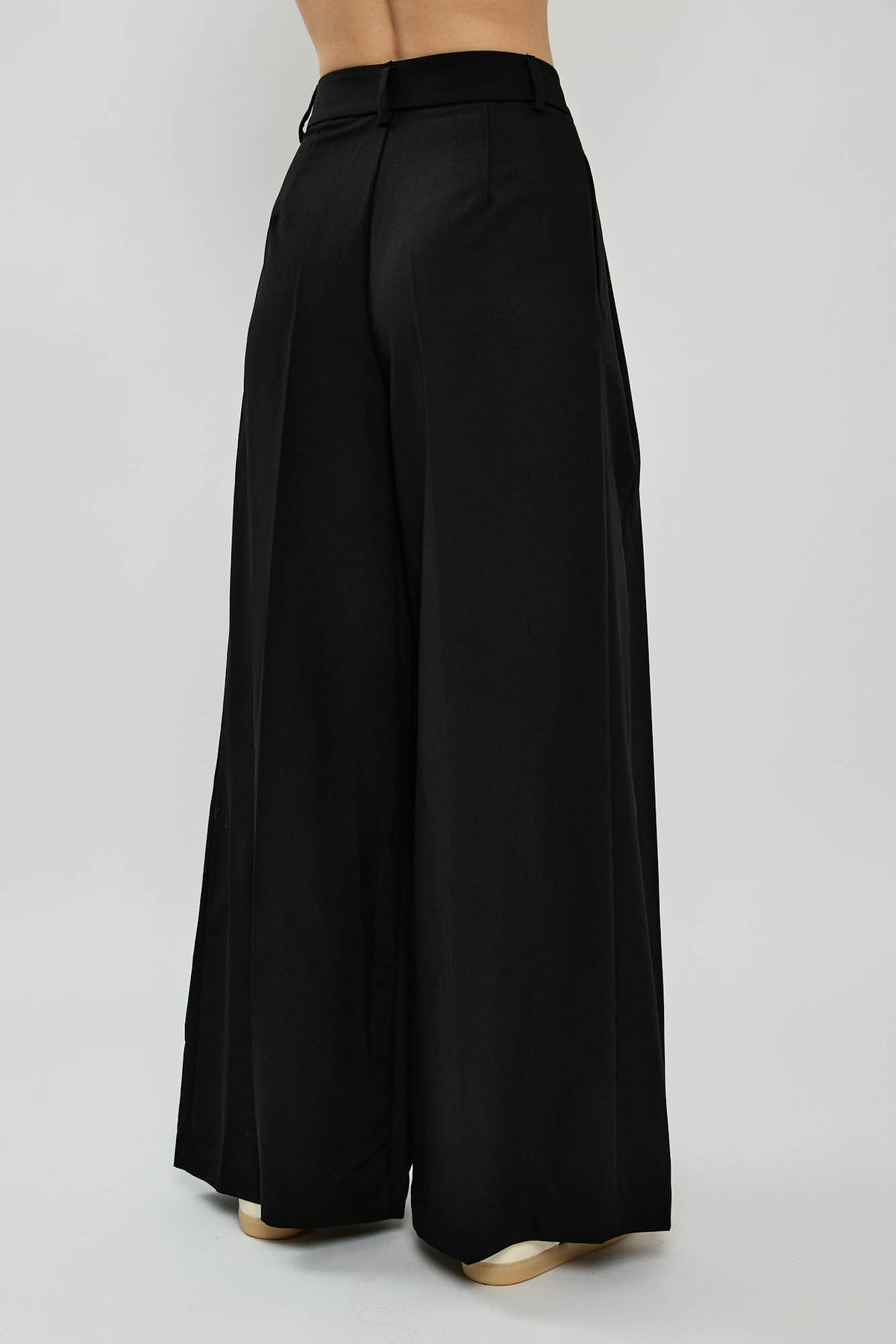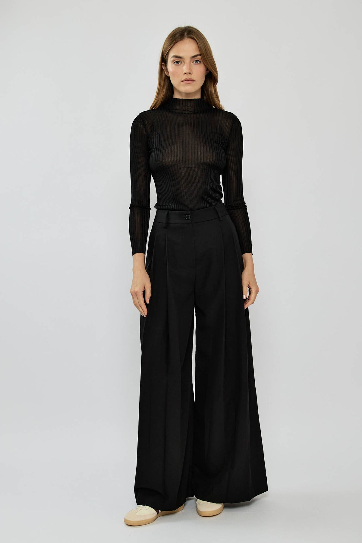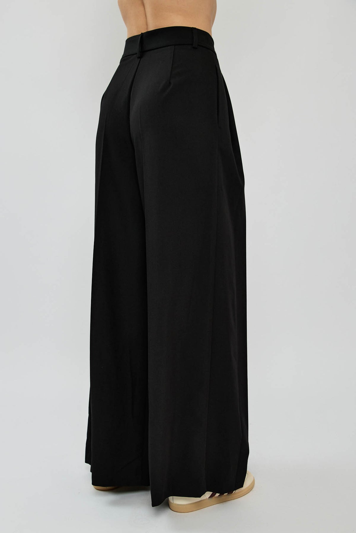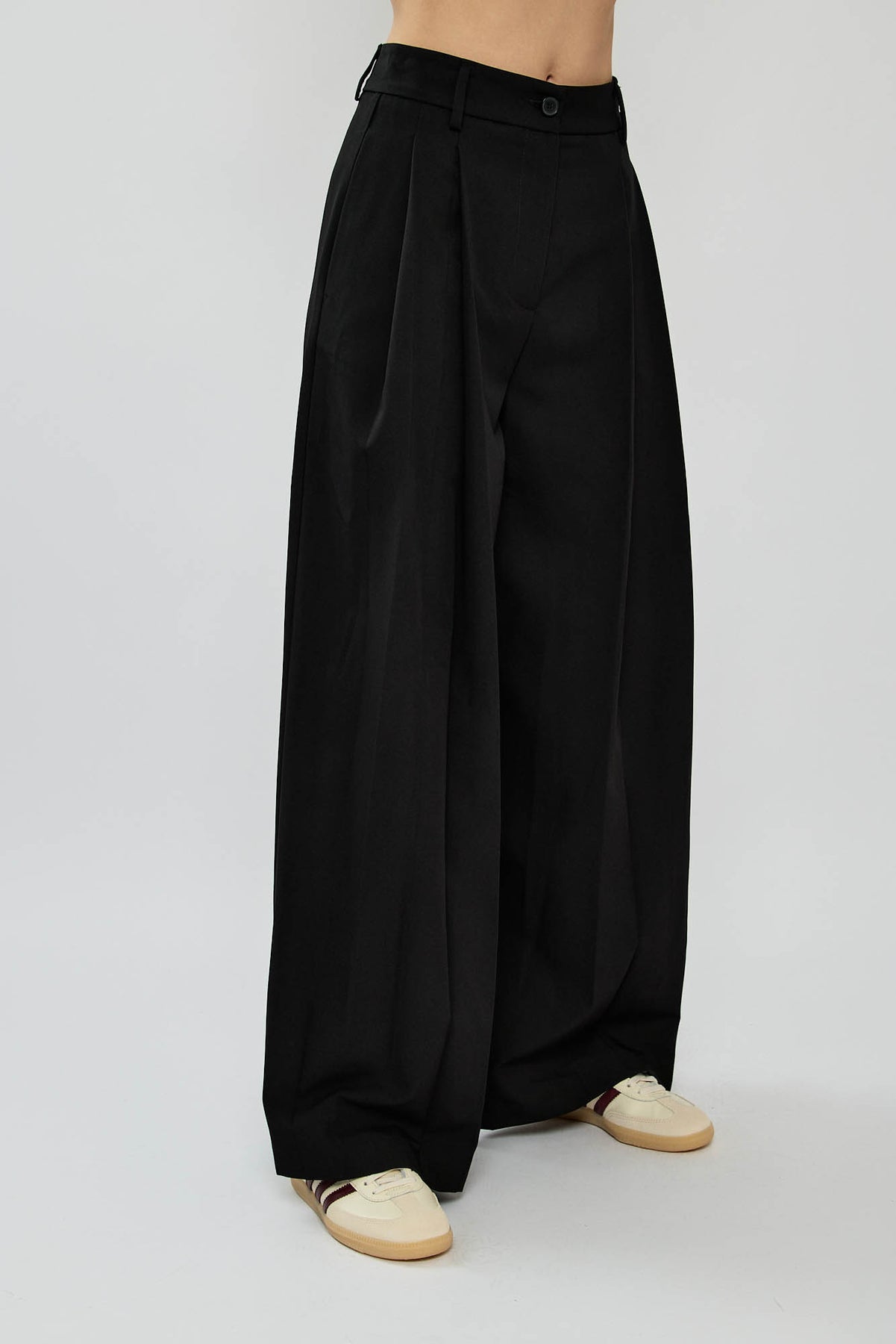 מכנסיים מחויטים בגזרה ישרה ורחבה במיוחד, עם קו תפר קדמי שמאריך את הרגליים, חגורת מותן עם כפתור וכיסים צדדיים. בד נופל ונעים שמוסיף טאץ' אלגנטי ללוק שלך – מושלם לשילוב עם סניקרס או עקבים.