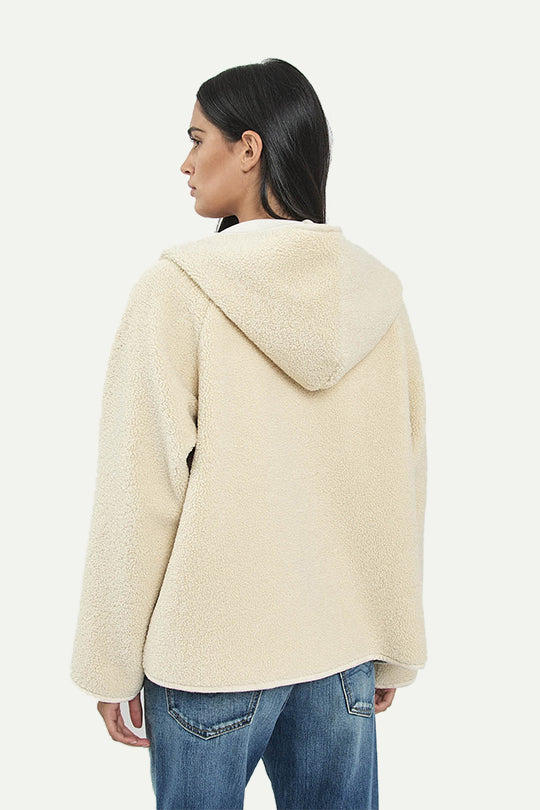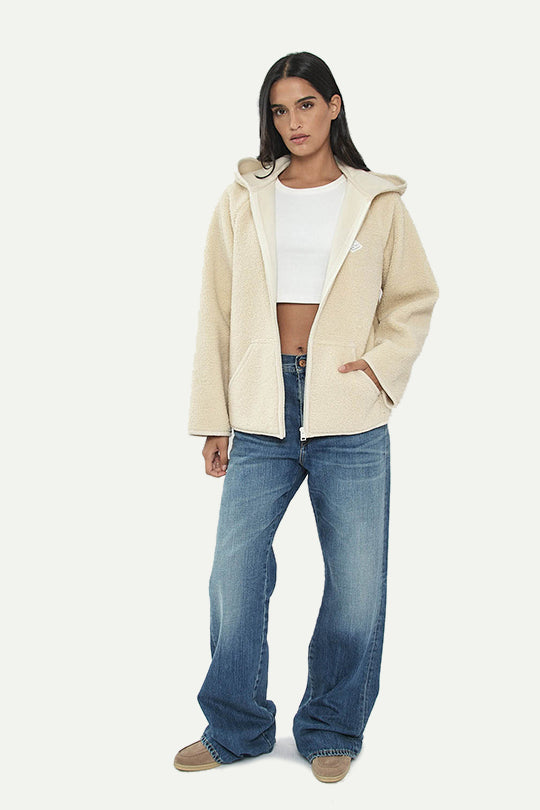 מעיל חורפי רך וחמים בגזרת רילקס, עשוי בד טדי סינתטי נעים למגע. סגירת רוכסן קדמית, שני כיסים צדדיים וקפוצ'ון מרופד לנוחות ביום קר. עיצוב נקי עם לוגו קטן על החזה—מושלם לשכבות מעל טופ וג’ינס ללוק יומיומי מחמם.
