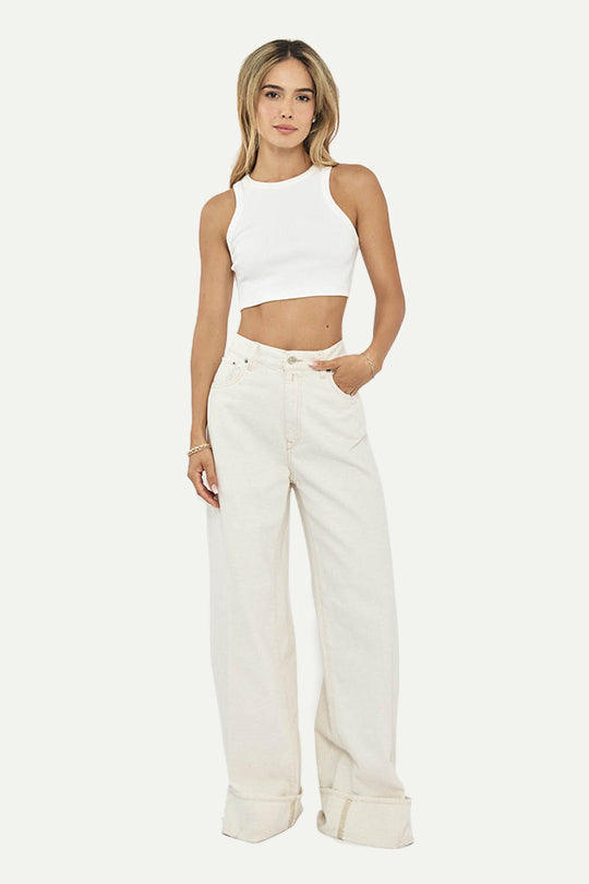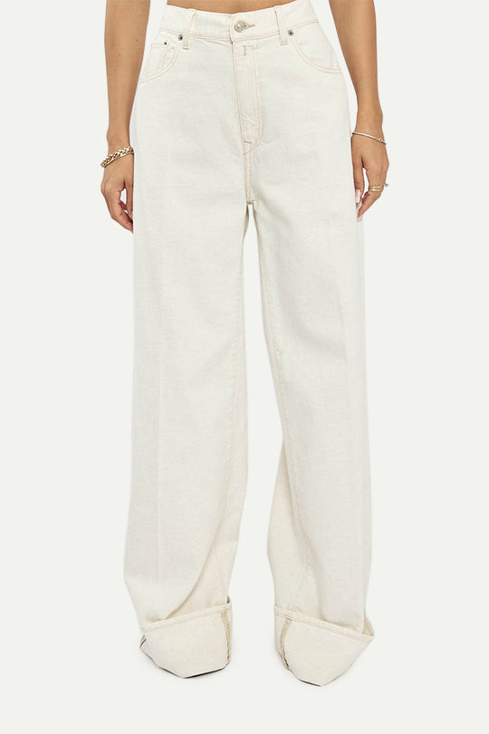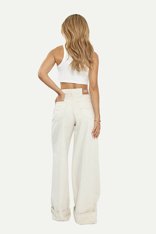 ג’ינס בגזרה רחבה עם מותן גבוהה, סגירת רוכסן וכפתור, כיסים קדמיים ואחוריים, ושולי קפל עבים להשלמת הלוק.