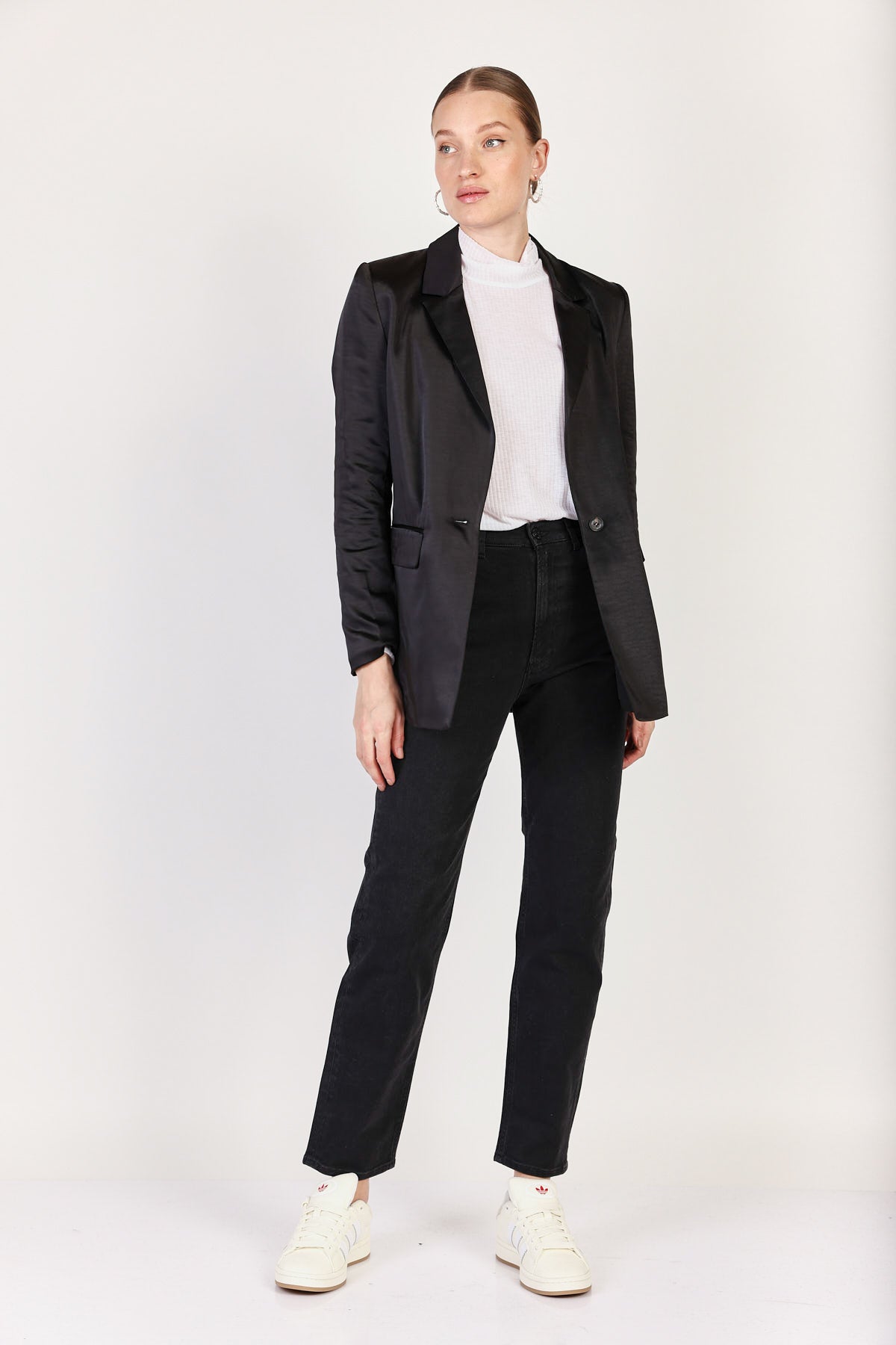 מדובר בג'קט העשוי מבד סאטן שיוצר מראה רך ונחשק. לדגם גזרה קלאסית וישרה שנשפכת על הגוף, נסגר בסגירת כפתור אחד בודד. מדובר בפיס היסטרי שירים לך כל לוק!