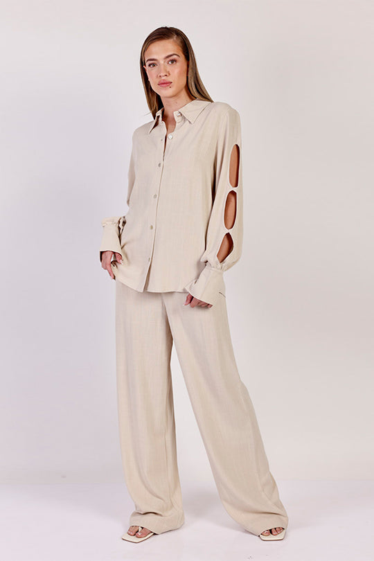 חולצת פשתן מכופתרת Cut Out Sleeves בצבע בז'
