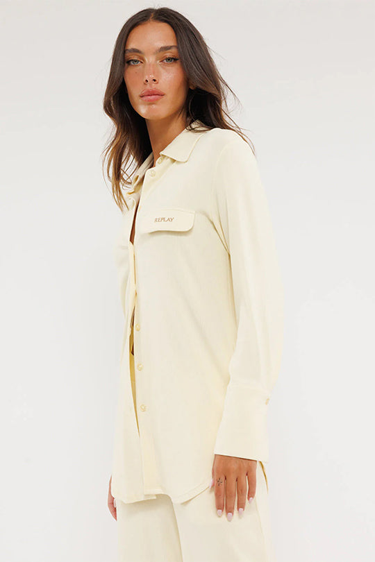 חולצה מכופתרת ארוכה לנשים בגוון לבן שמנת, עשויה מבד רך ונעים למגע. עם כיס קדמי מעוצב וכפתורים תואמים, החולצה משדרגת כל הופעה ומתאימה ללבישה ביום-יום או לאירועים מיוחדים. ניתן לשלב עם מכנסי פאלאצו תואמים למראה שלם ומסוגנן. לינק למכנסיים כאן