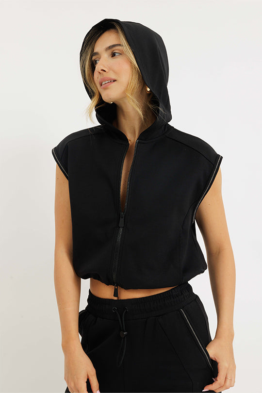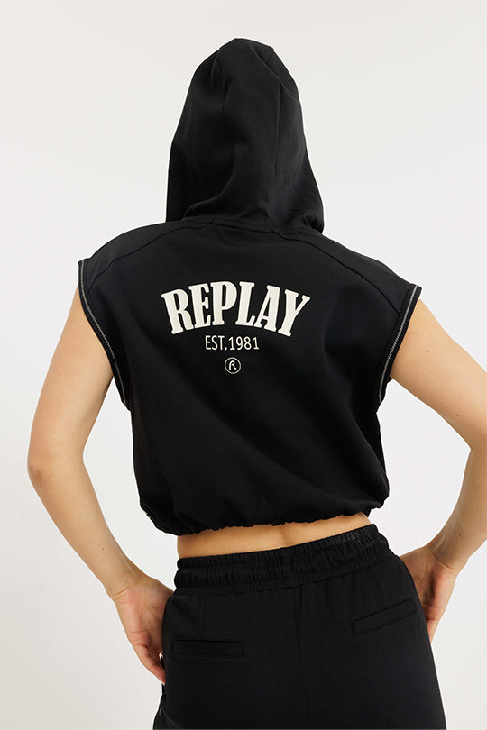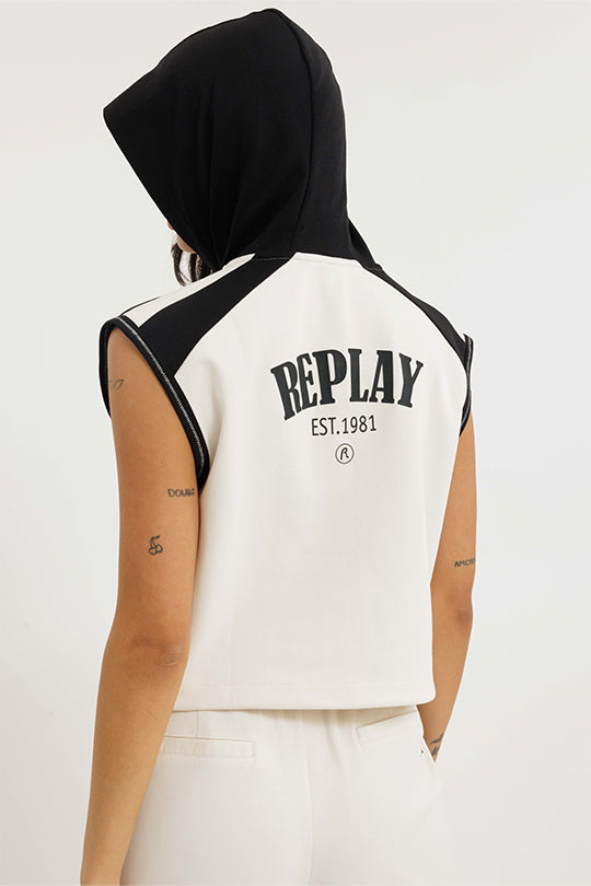 וסט לנשים עם קפוצ'ון, בגוון לבן אוף-וויט עם שילובי שחור בקפוצ'ון, בכתפיים ובתפרים. עשוי בד נעים ונוח, בגזרה קצרה וללא שרוולים, עם רוכסן מלא בחזית ושרוך להתאמה בגב התחתון. בגב מופיע הדפס לוגו REPLAY בולט עם הכיתוב EST. 1981. מתאים ללוק קז'ואלי, ספורטיבי או שכבת ביניים טרנדית.