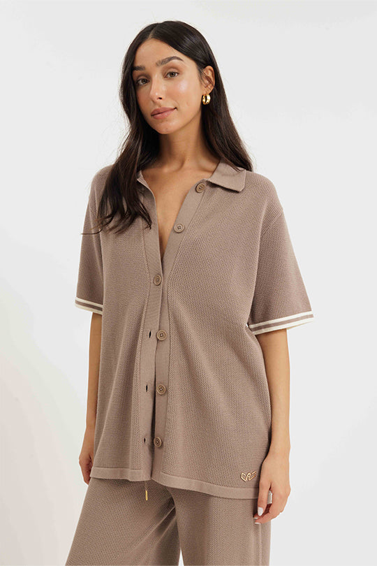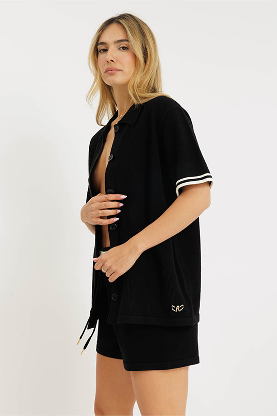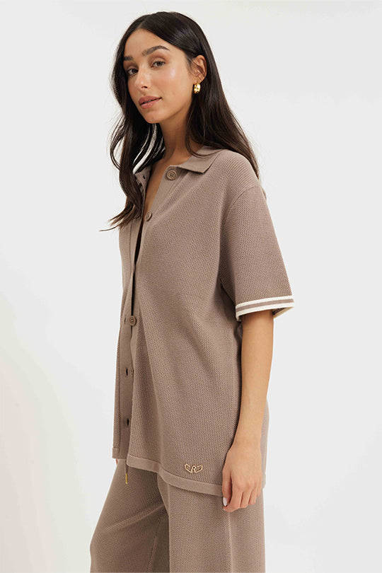 חולצת כפתורים קצרה מבית ריפליי בגזרת אוברסייז עם מראה ריב רך ונעים למגע. עשויה בד רשת נושם עם שרוולים קצרים וסיומת פס כפול בקצה השרוול למראה ספורטיבי ומעודכן.