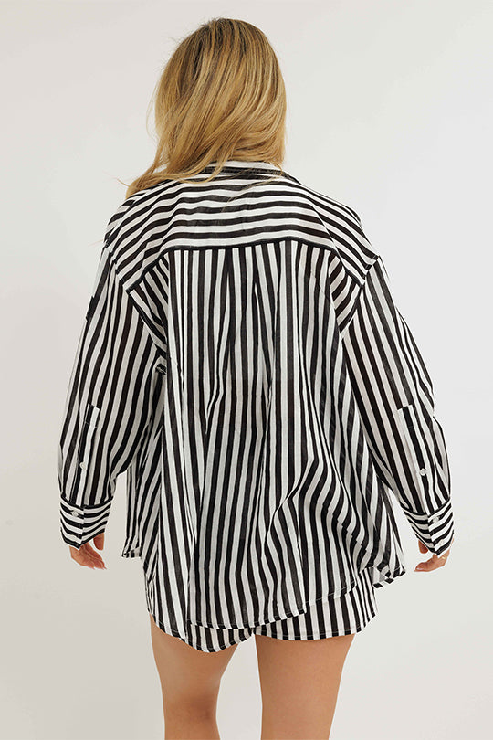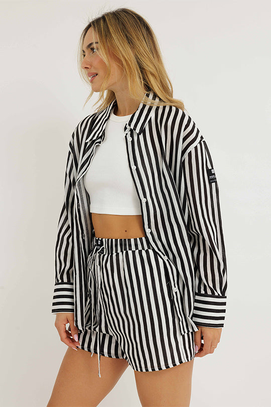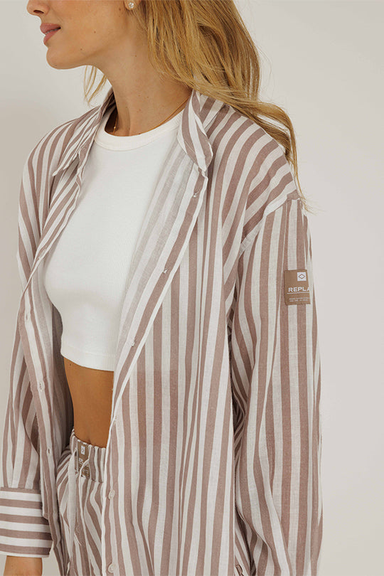 חולצה ארוכה לנשים עם כפתורים בגזרת אוברסייז קלילה, בדוגמת פסים ורודים ולבנים. עשויה מבד רך ונושם, מתאימה ללבישה פתוחה מעל טופ או סגורה כפריט לבוש בפני עצמו. מעניקה מראה צעיר, רענן ונינוח – מושלמת ליום קיץ קליל, חופשה או לוק ביתי מלא בסטייל.