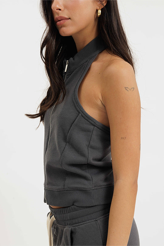 גופייה בגזרת סטרפלס עם צווארון גבוה ורוכסן קדמי מלא, עשויה בד טרי נעים בגוון בז'. הגב פתוח לגמרי בגזרת סטרפלס נקייה, עם תווית עור קטנה במרכז שמוסיפה טאץ' ייחודי. פריט בולט שמשלב בין קז'ואל לאדג'יות בסטייל אורבני.