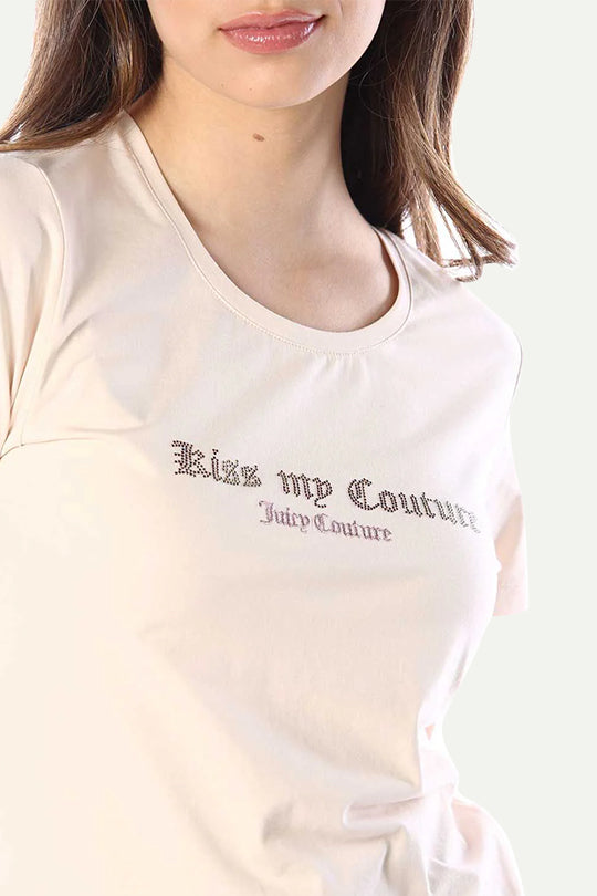 טי שירט קצרה עם מפתח צוואר עגול ושרוולים קצרים. לחולצה הדפס כיתוב בחזית.