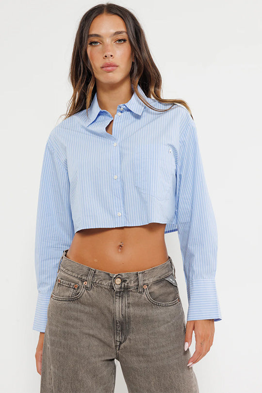 חולצת קרופ מכופתרת לנשים מבית Replay בעיצוב פסים קלאסי בשילוב צבעי כחול ולבן. החולצה משלבת מראה אופנתי ומודרני עם גזרה קצרה ורחבה, שמדגישה את קווי המתאר הנשיים בצורה אלגנטית. החולצה המושלמת לשילוב עם מכנסיים בגזרה גבוהה, ליצירת מראה יום-יומי מתוחכם ומלא בסטייל.