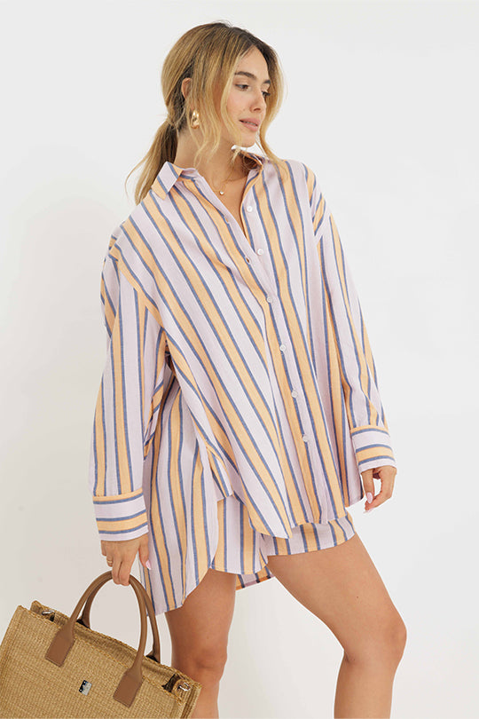 חולצת כפתורים ארוכה ומאווררת לנשים עם דוגמת פסים בגווני סגול וכתום רך. גזרת אוברסייז נוחה עם שרוולים ארוכים וכפתורים לכל האורך. אידאלית ללוק קייצי קליל – כטופ מעל גופיה, לבילוי על החוף או לשילוב עם מכנס תואם.