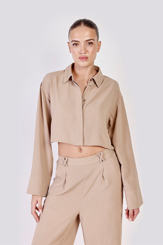 חולצת פשתן מכופתרת Cut Out Sleeves בצבע בז'