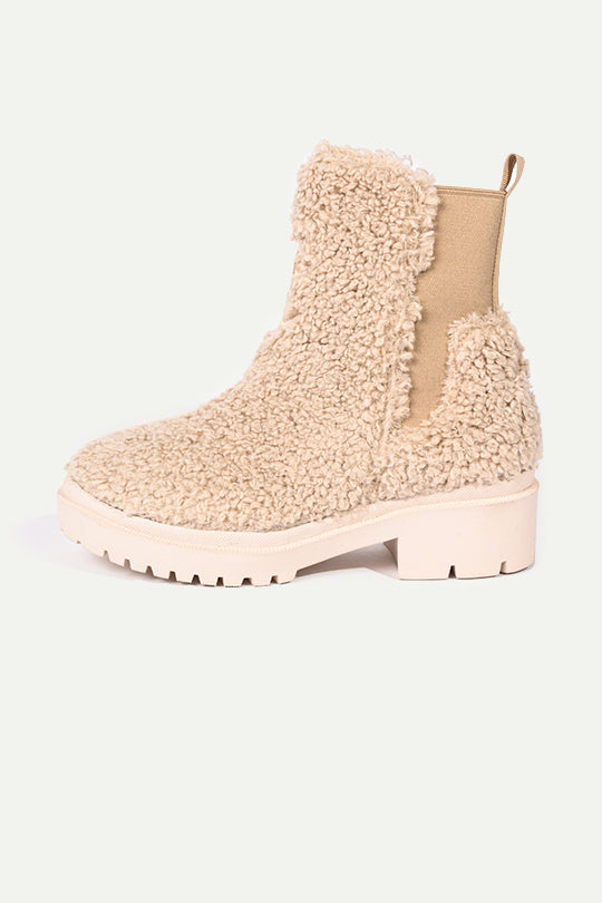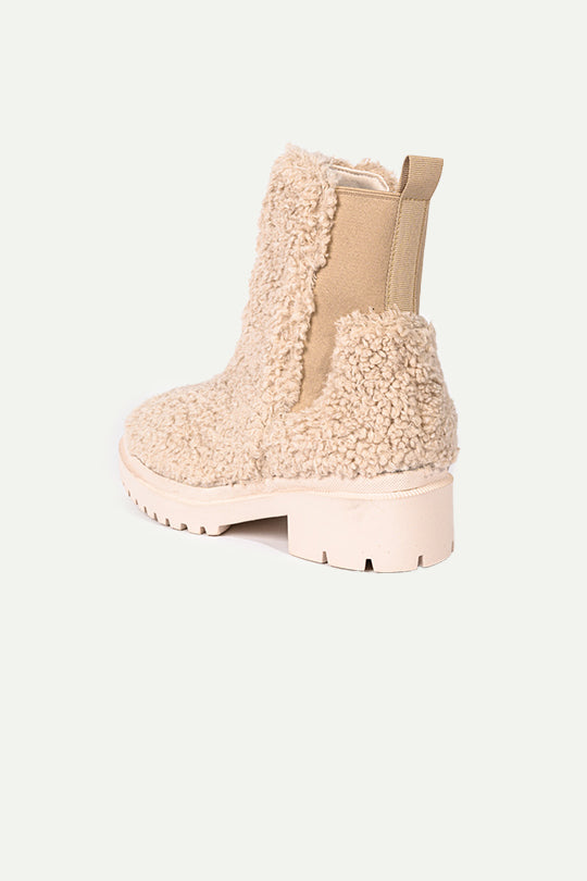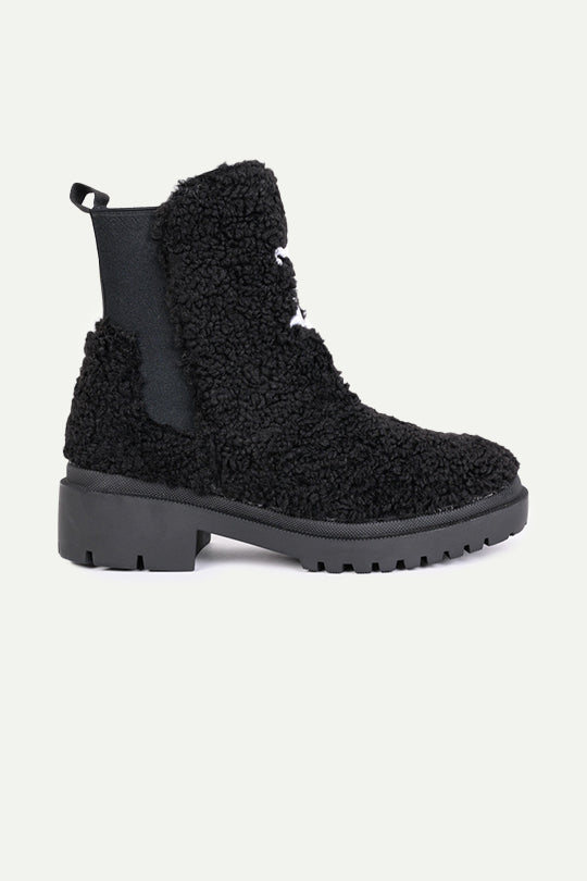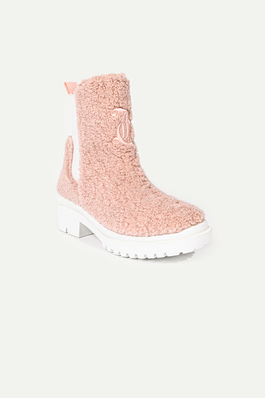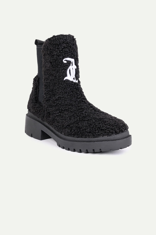 מגפוני עקב עם פרווה סינטטית ושילוב לוגו ראשי תיבות רקום בגפה החזיתית.