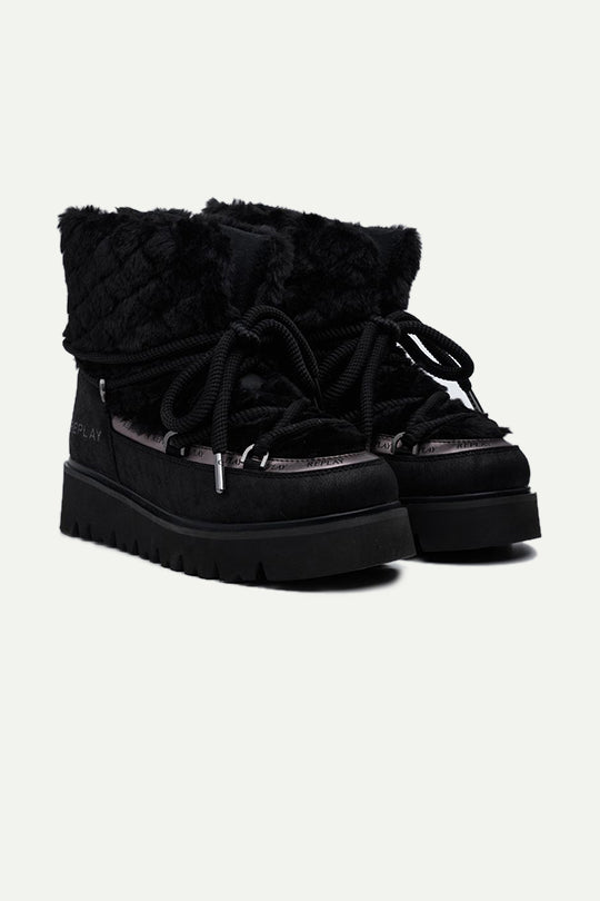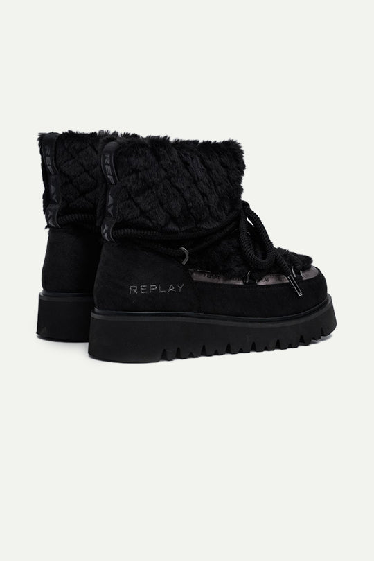 מגפוני חורף לנשים בעיצוב מחמם ומפנק עם שרוכים היקפיים. שילוב דמוי זמש עם פרווה רכה ומרקם קווילט בחלק העליון, לוגו REPLAY צדדי ולשונית משיכה לנעילה נוחה. סוליית פלטפורמה קלה ומחורצת לאחיזה יציבה ובידוד טוב בימים קרים. מושלמים ללוק חורפי טרנדי עם ג׳ינס או טייטס.