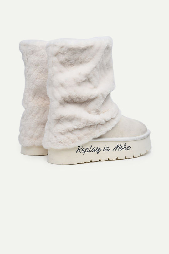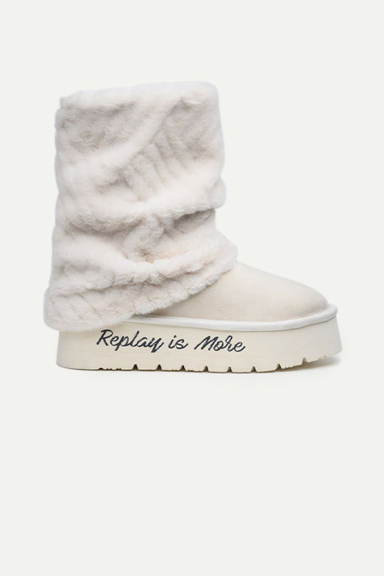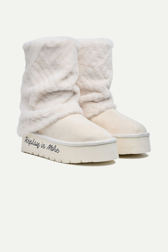 Boots חורפיים בצבע אוף וויט עם פרווה רכה וקיפול בקרסול, סוליה עבה ומחורצת לנוחות ואחיזה, והדפס צד עדין. מושלמים לימים קרים.