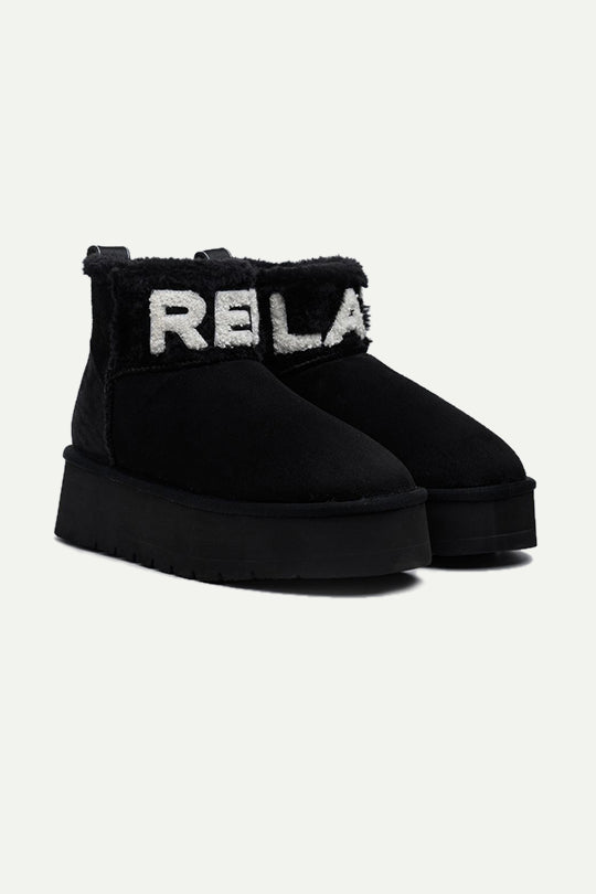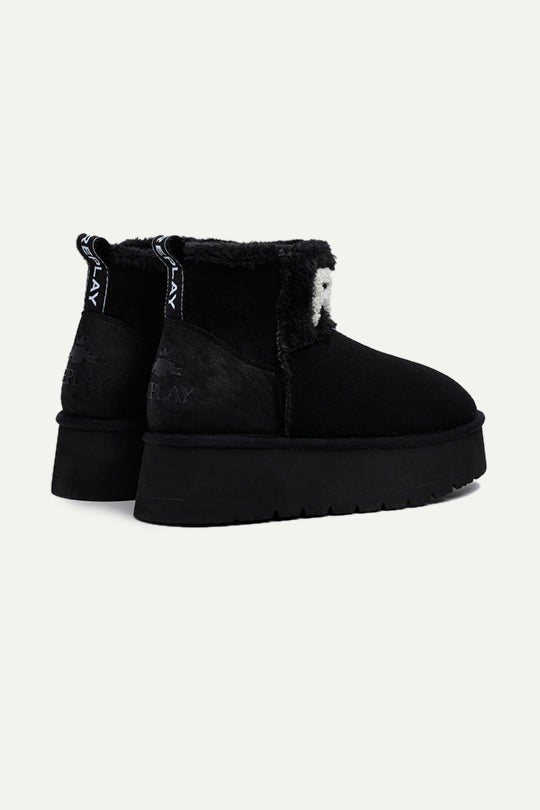 מגפונים שטוחים בעיצוב עכשווי עם סוליית פלטפורמה נוחה ומראה בולט. עשויים דמוי זמש רך עם בטנה פרוותית לחורף חמים וסטייליסטי. הלוגו הבולט בחזית מוסיף טאץ’ אופנתי שמבדיל אותם מכל זוג אחר. שילוב מושלם בין נוחות לסטייל עירוני.