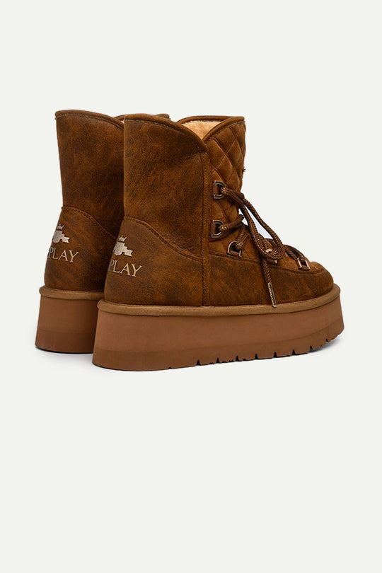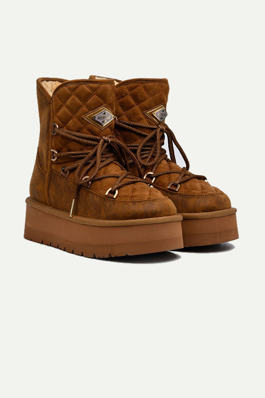 מגפיים גבוהים בעיצוב קווילט מרופד עם סוליית פלטפורמה רחבה ונוחה. עשויים דמוי עור חום עם בטנה חמה ורכה לנוחות מושלמת בימים קרים. השרוכים העבים והלוגו המטאלי מעניקים להם מראה ייחודי ואורבני. שילוב מדויק של חום, סטייל ופונקציונליות.