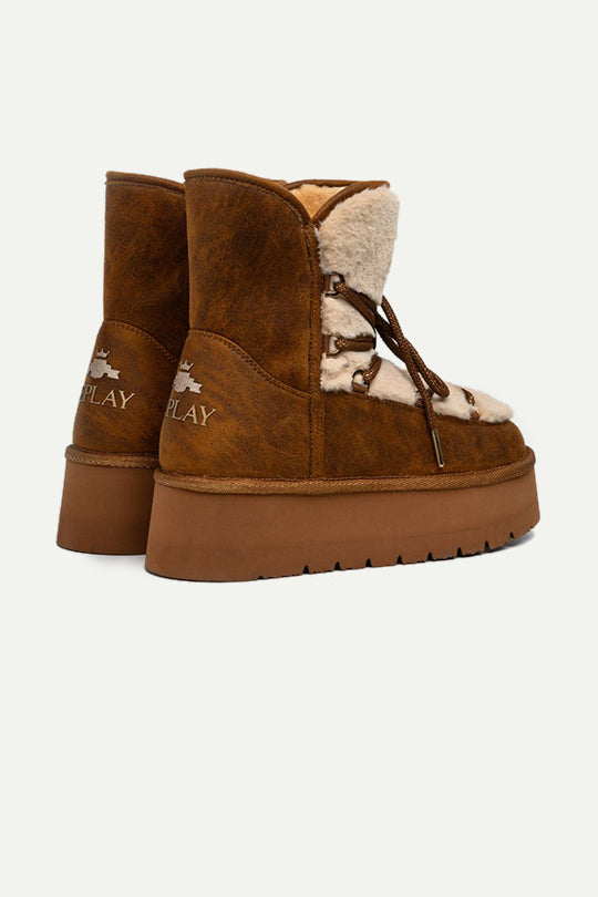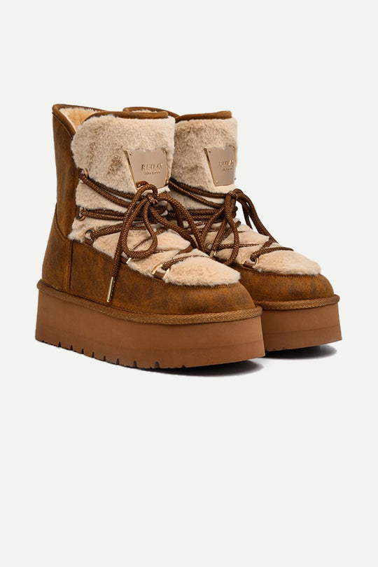 מגפוני חורף לנשים בעיצוב חמים ומפנק בגוון חום. עשויים דמוי־עור עם בטנת פרווה רכה ונעימה, שרוכים היקפיים למראה אופנתי והתאמה יציבה. סוליית פלטפורמה קלה ומחורצת מעניקה אחיזה ובידוד מצוינים בימים קרים. מושלמים לשילוב עם ג׳ינס או טייטס ללוק חורפי טרנדי ונוח.
