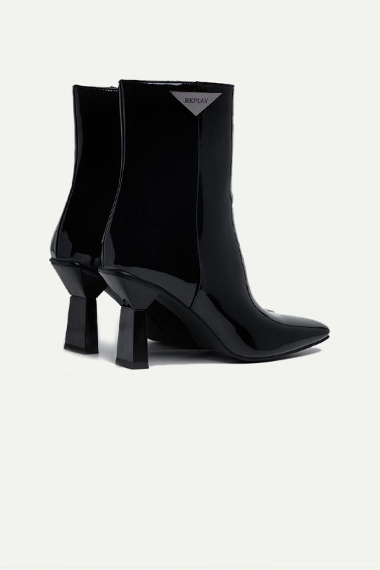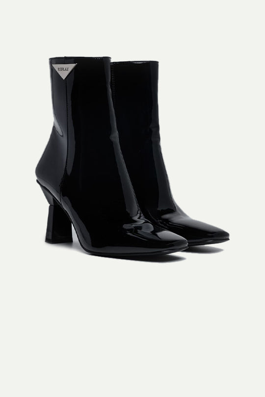 מגפוני קרסול לנשים בגימור לק מבריק בגוון בורדו עמוק. עיצוב אלגנטי עם חרטום מעוגל־מחודד, עקב בינוני רחב לנוחות ויציבות, ורוכסן צדדי לנעילה קלה. תגית מתכת משולשת עם הלוגו בצוואר הנעל משלימה את הלוק. מושלמות לשילוב עם שמלה או ג׳ינס סקיני למראה נשי ומתוחכם.