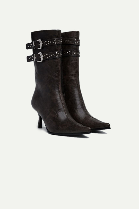 מגפיים לנשים בעיצוב אלגנטי ובגוון חום כהה עם טקסטורת עור עדינה. הדגם כולל עקב בינוני צר, שני רצועות עם אבזמים מטאליים וניטים כסופים להשלמת מראה רוק-שיק יוקרתי. נוחות ואלגנטיות שמשתלבות בלוק מושלם ליום או לערב.