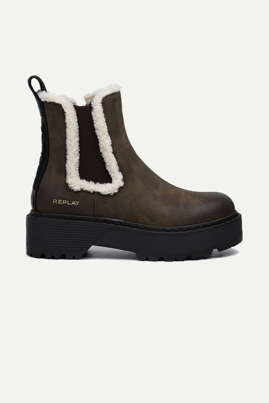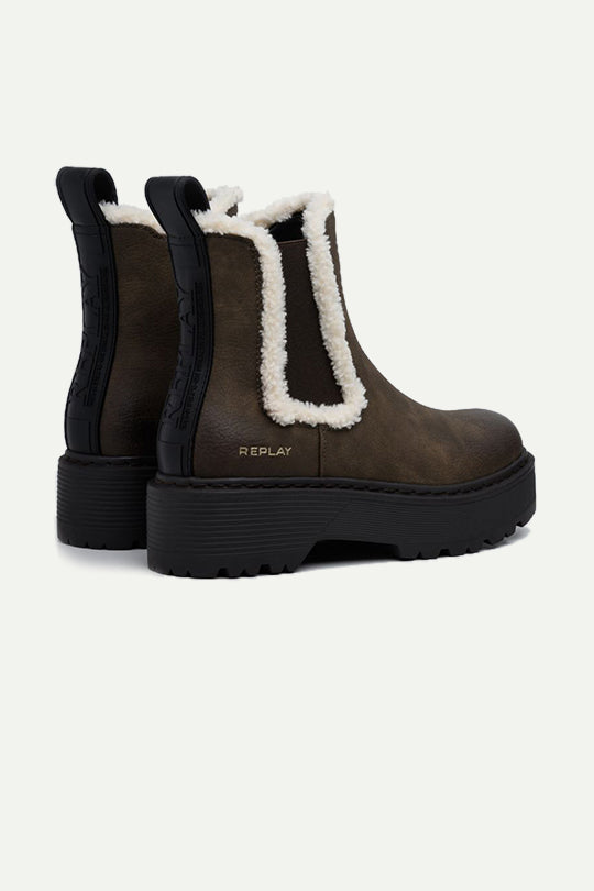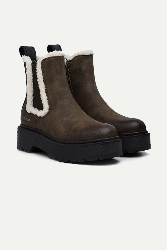 מגפי חורף לנשים בגזרת צ’לסי בצבע חום ממורק, עם סוליית טרקטור שחורה עבה לאחיזה ויציבות. שולי פרווה סינתטית לבנה מסביב לאלסטיים הצדדיים מוסיפים חום וסגנון חורפי, ולוגו REPLAY עדין בעקב. לולאת משיכה מאחור לנעילה מהירה ורפידה מרופדת לנוחות ביומיום. מושלמות עם ג’ינס, שמלה וסוודר ללוק אורבני חורפי.