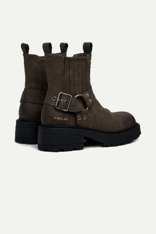 מגפיים בעיצוב בייקר קלאסי בגוון חום עם סוליית טרקטור עבה לנוחות ואחיזה מרבית. עשויות דמוי עור איכותי עם רצועת אבזם דקורטיבית בצד ופרטי ניטים למראה אופנתי ואורבני. לוגו REPLAY מודפס בגב העקב. מתאימות לשילוב עם ג׳ינס, שמלה או חצאית ללוק קשוח ואלגנטי.