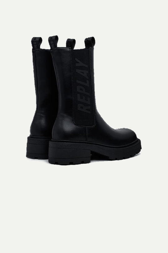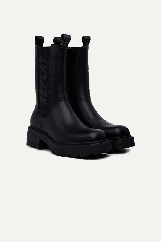 מגפי צ’לסי גבוהים בסגנון בייקר בגוון שחור, עם אלסטיק צד גדול ועליו לוגו REPLAY טונאלי. גפת דמוי־עור חלקה, לולאות משיכה לנעילה מהירה וסוליית טרקטור עבה ליציבות ואחיזה מעולה. שילוב מושלם של מראה אורבני נקי ונוחות יומיומית – מתאים לג’ינס, שמלה או חצאית בחורף.