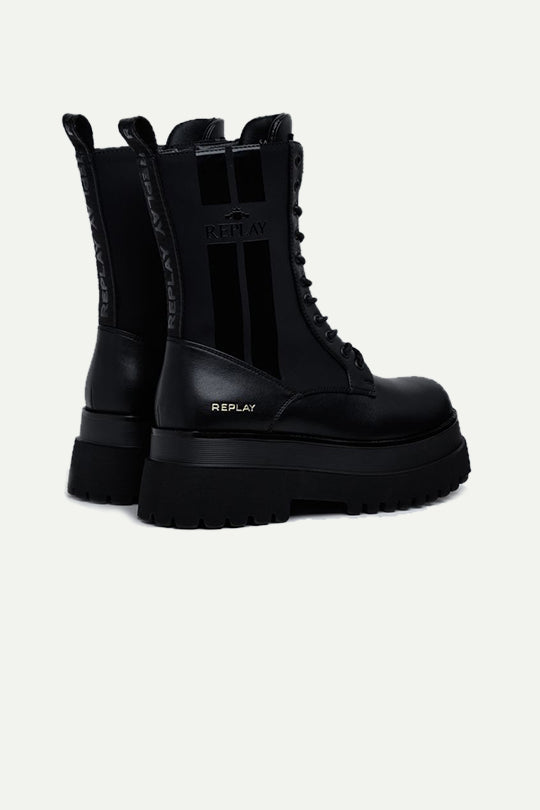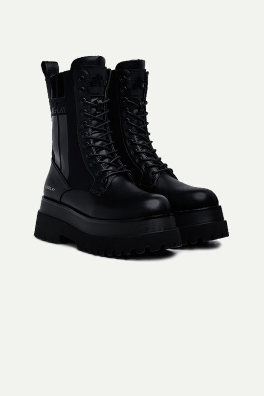 מגפיים גבוהים לנשים בעיצוב קומבט עם שרוכים מלאים, בגוון שחור. עשויים דמוי-עור איכותי בשילוב פאנלים צדדיים בגימור מבריק/שקוף עם הדפס לוגו עדין. סוליית פלטפורמה עבה ומחורצת מעניקה יציבות ואחיזה מצוינת, לולאות מתכת ורצועת משיכה מאחור לנעילה נוחה. מראה אורבני נועז שמתאים לשילוב עם שמלות, חצאיות או ג’ינס.