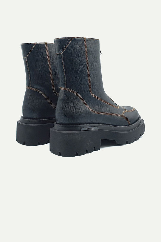 מגפי נשים מדגם ORPHEA בעיצוב אורבני ונועז בצבע שחור, עם תפרים חומים דקורטיביים להדגשת המבנה. עשויים דמוי עור איכותי עם רוכסן קדמי לנעילה נוחה ומהירה. סוליית טרקטור עבה מעניקה מראה בולט ונוחות מירבית גם בימים ארוכים. מתאימים לשילוב עם לוק אלגנטי־אורבני או יומיומי חורפי.
