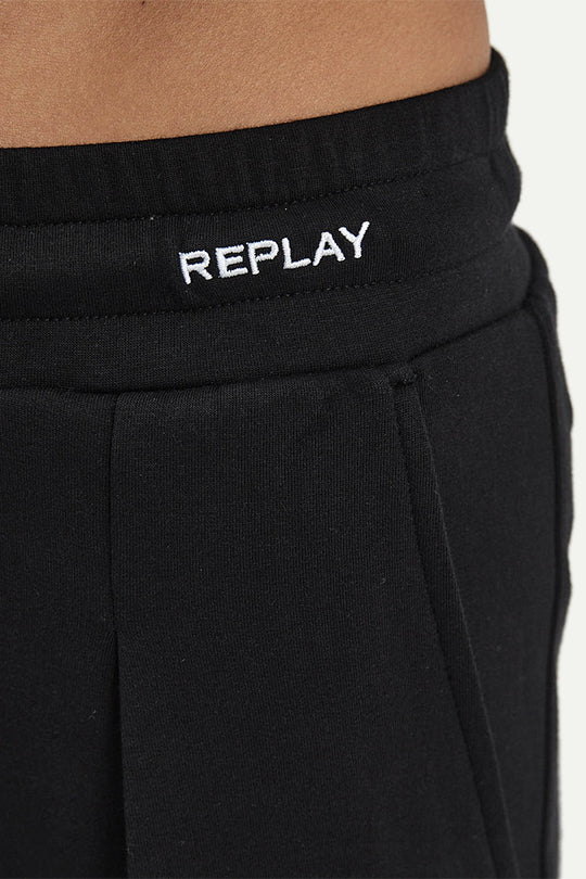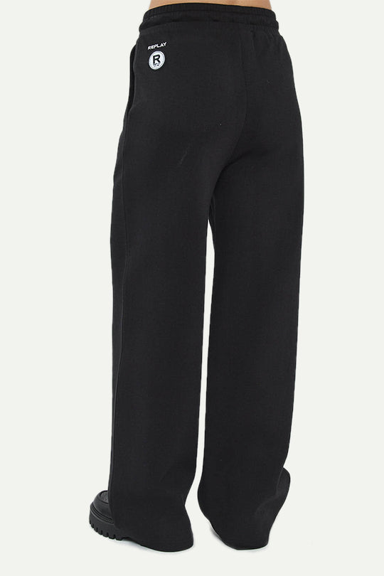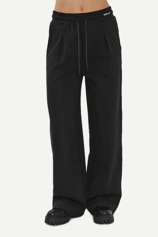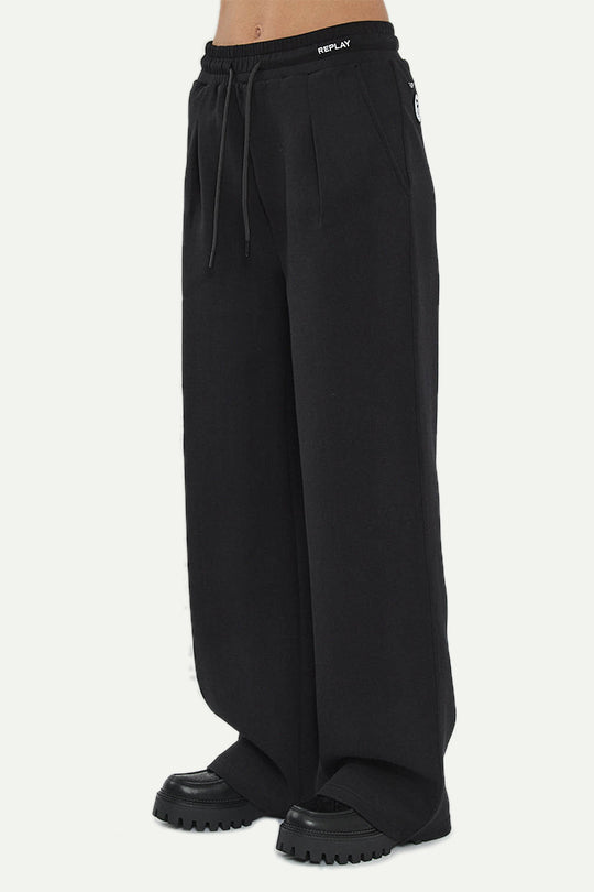 מכנסי טרנינג מבד אינטרלוק בגזרה רחבה עם שרוך במותן וקפלים עדינים מקדימה. מגיעים בצבע שחור עם לוגו קטן בחגורה וכיסי צד. בד נעים עם נפילה יפה, מתאים כסט עם הקפוצ’ון התואם או כלוק יומיומי נקי.