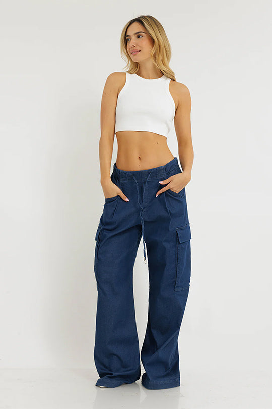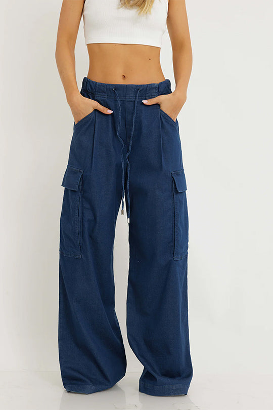 מכנסי ג'ינס רחבים לנשים בעיצוב אופנתי ומשוחרר, עם כיסים גדולים בצדדים להשלמת הלוק הטרנדי. עשויים מבד נוח וגמיש, עם מותן אלסטית הכוללת שרוך להתאמה אישית ונוחות מקסימלית. מתאימים לשילוב עם חולצת קרופ וסניקרס ללוק אורבני ומעודכן.