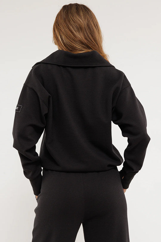 סווטשירט נשים ארוכה ונוחה מבד וואפל איכותי, עם רוכסן לחזית וצווארון גבוה להשלמת הלוק. מושלמת ללבישה יומיומית בסגנון קז'ואלי, עם התאמה קלה לכל פריט בארון שלך.