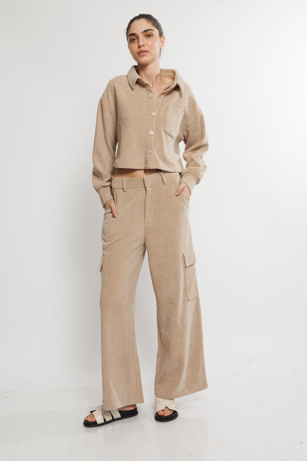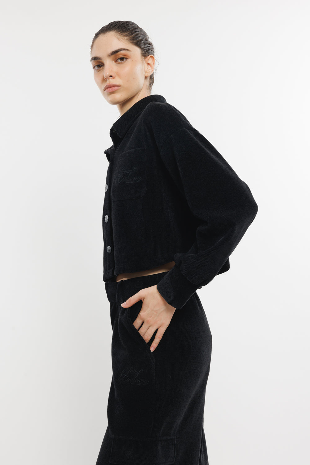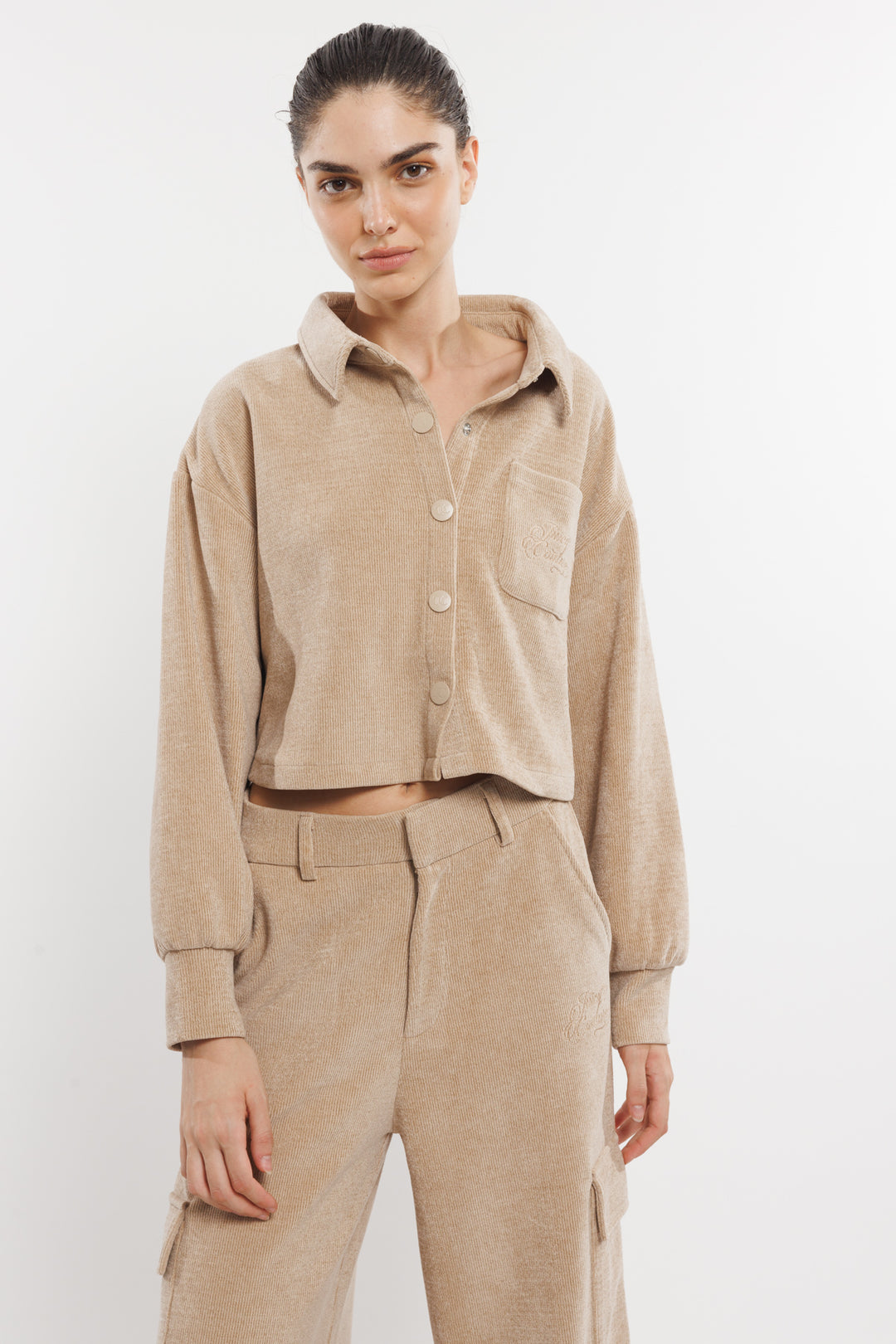 ג'קט קורדרוי בגזרת קרופ משוחררת עם שרוולים ארוכים וכפתורים בחזית. כוללת כיס קדמי עם רקמת לוגו עדינה. עיצוב נוח וקז'ואלי שמוסיף סטייל לכל לוק יומיומי.