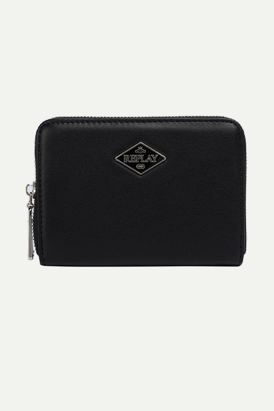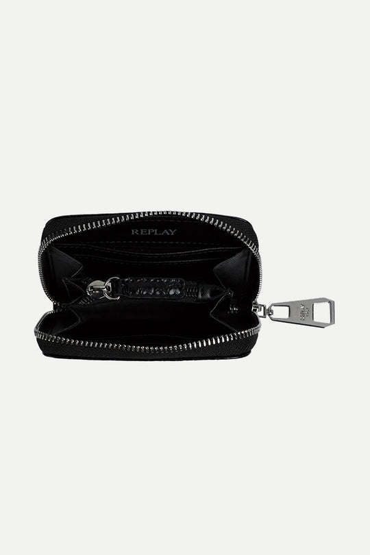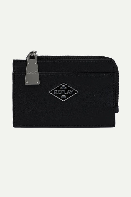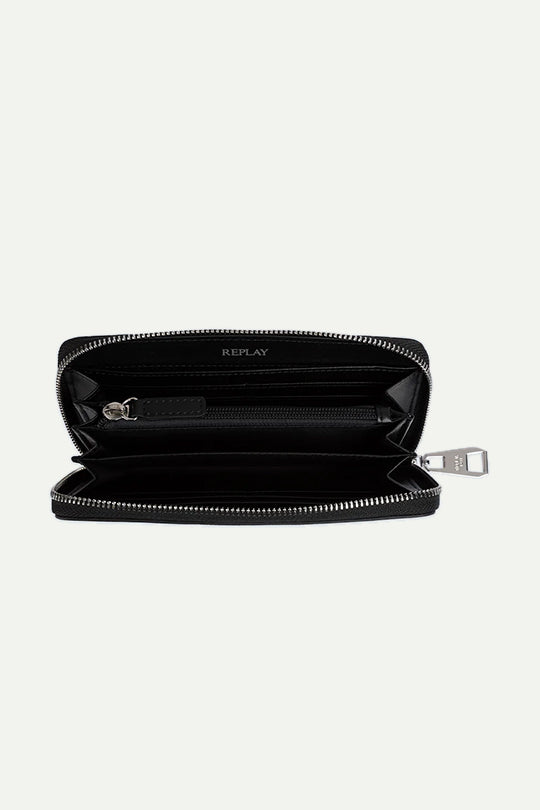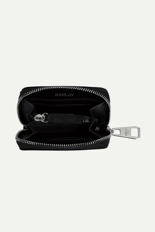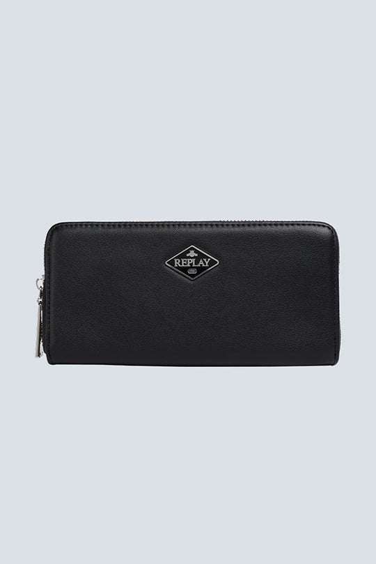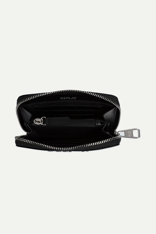 ארנק שחור עם רוכסן וכיתוב לוגו כסוף