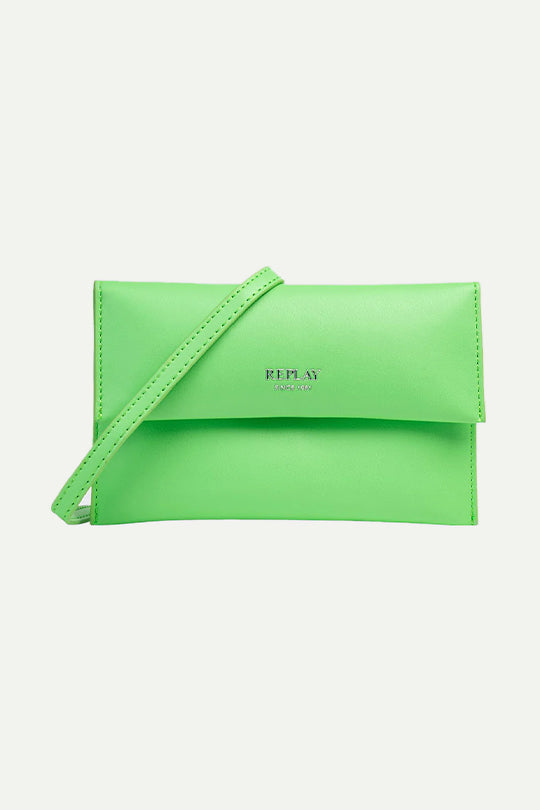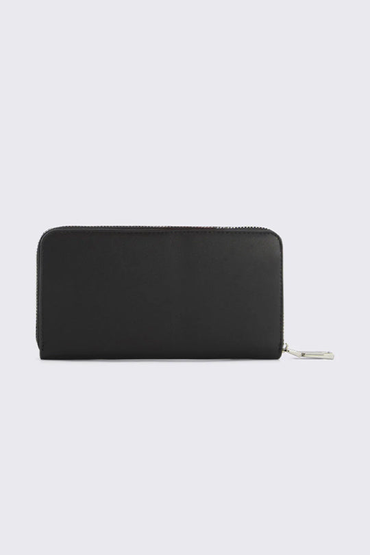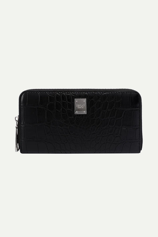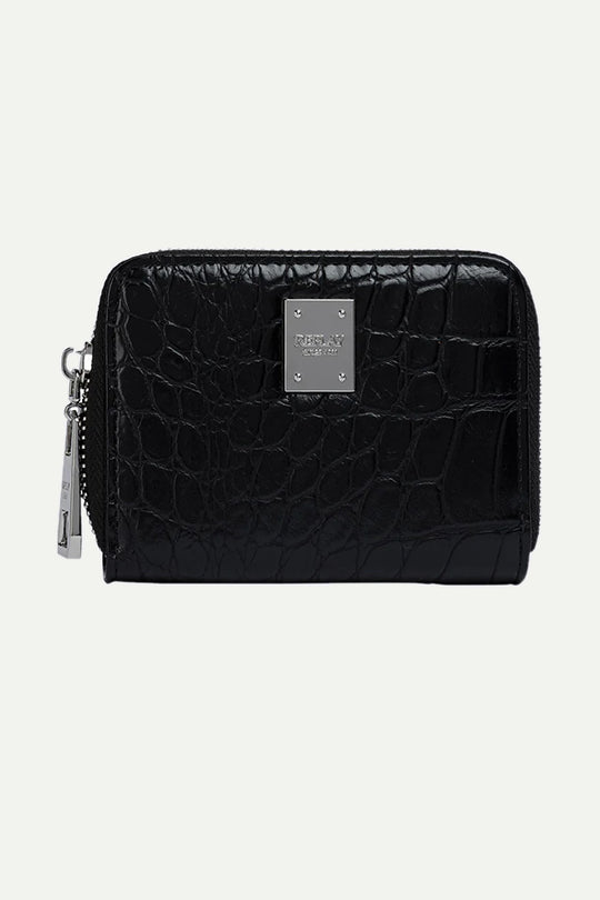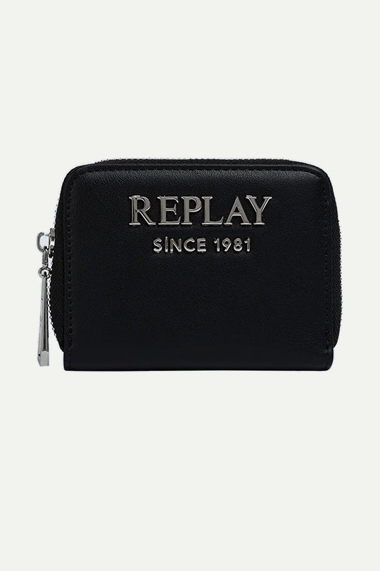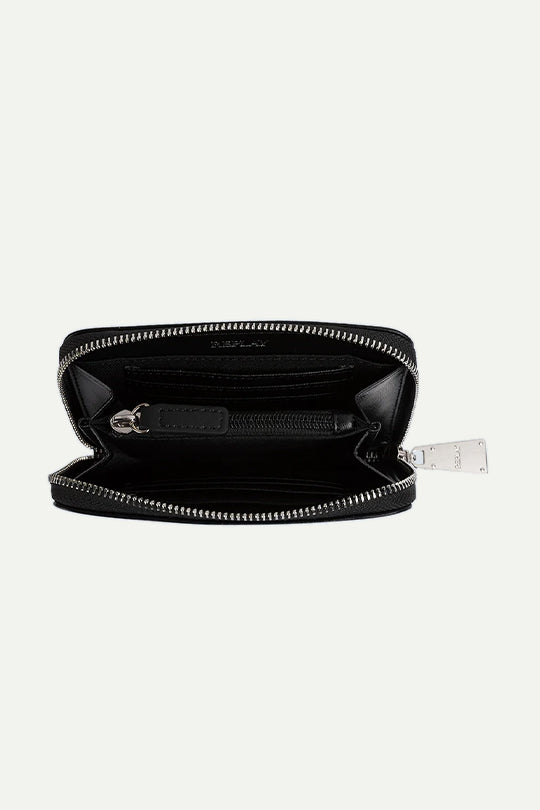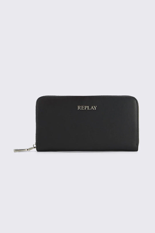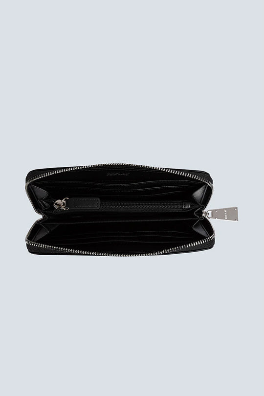 ארנק שחור עם רוכסן וכיתוב לוגו כסוף