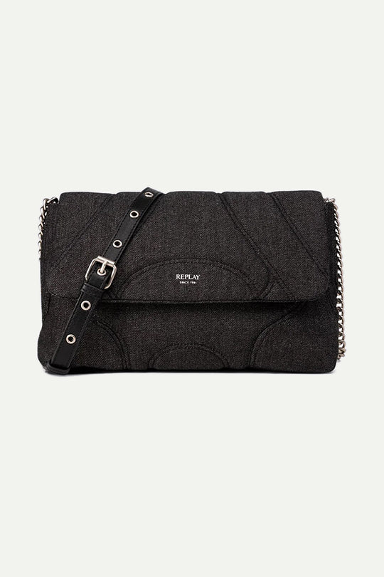 תיק צד אלגנטי בעיצוב קלאסי עם טוויסט מודרני, עשוי בד טוויד שחור בטקסטורה גיאומטרית ייחודית. כולל סגירת דש עם לוגו REPLAY מתכתי קטן, רצועת כתף מתכווננת משולבת עור ושרשרת כסופה. אידיאלי ללוק ערב מוקפד או לשדרוג הופעה יומיומית בשיק אירופאי נינוח.
