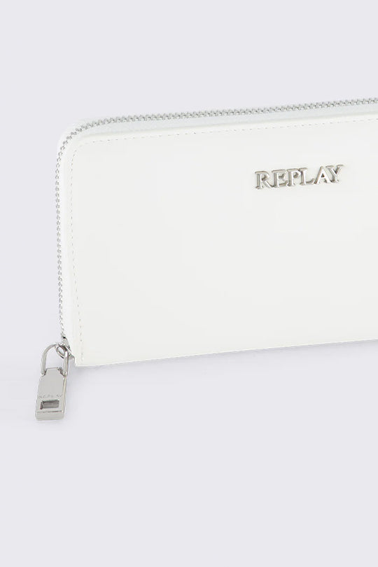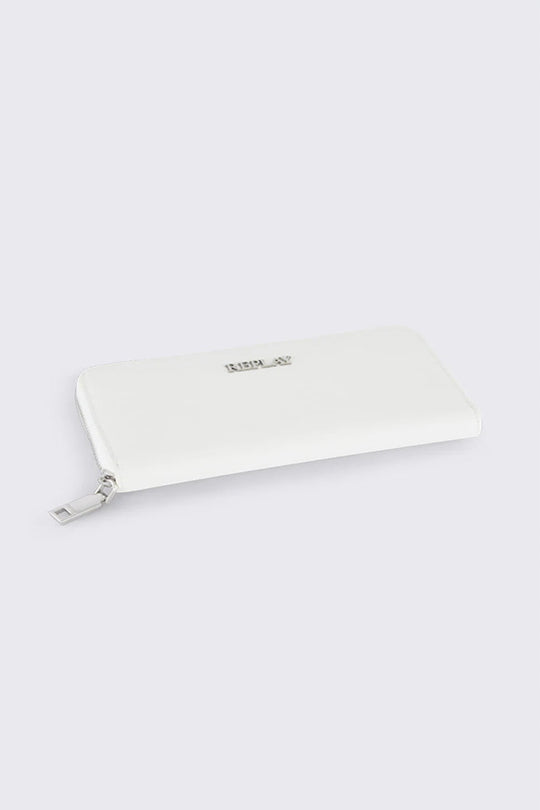 ארנק אופנתי לנשים מבית REPLAY בגוון לבן נקי ויוקרתי. עיצוב מלבני עם סגירת רוכסן היקפית בגימור מתכתי כסוף וסמל המותג בחזית. אידיאלי לאחסון שטרות, כרטיסים ומטבעות – משלב בין פונקציונליות לאלגנטיות, ומתאים לכל תיק ולכל לוק.