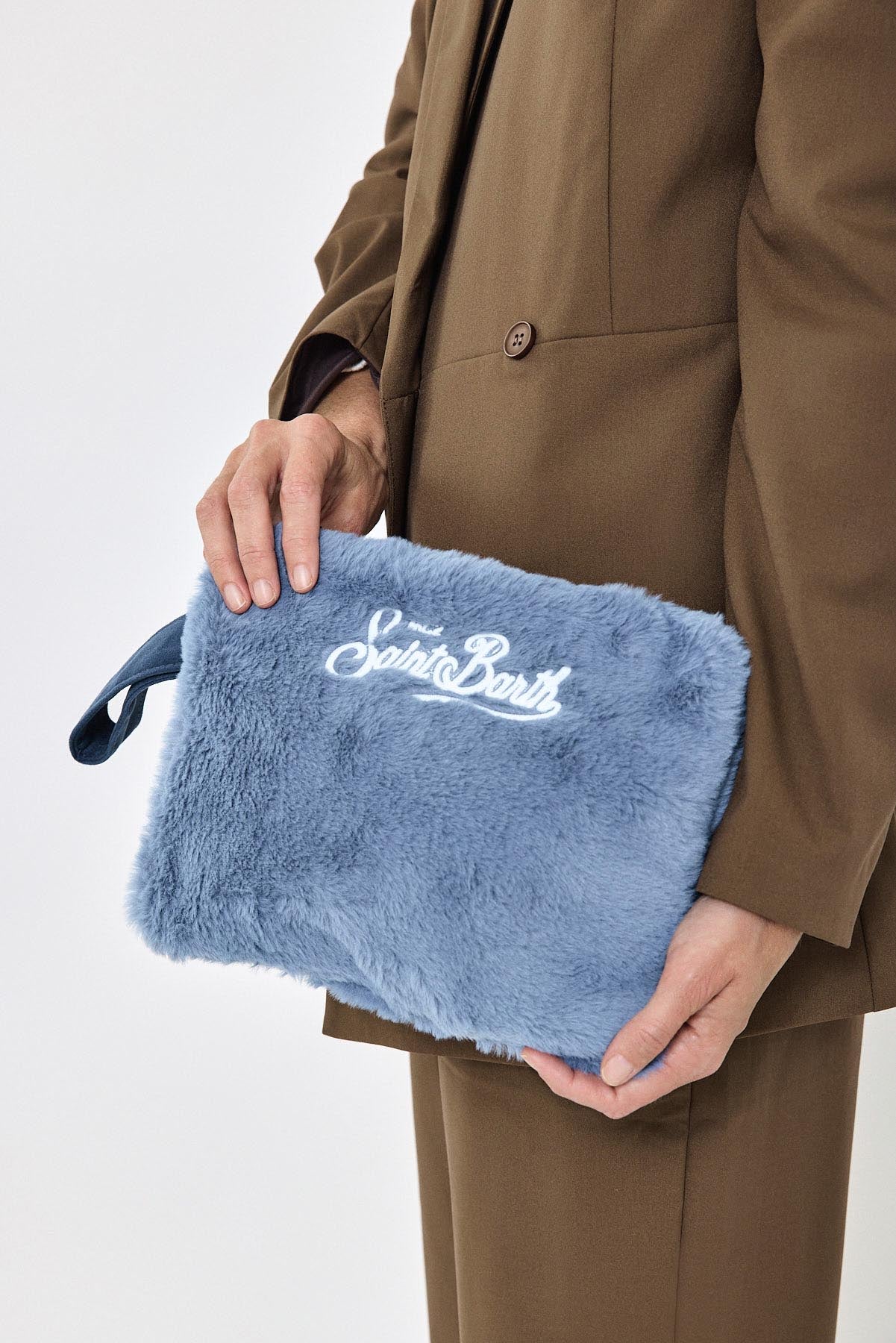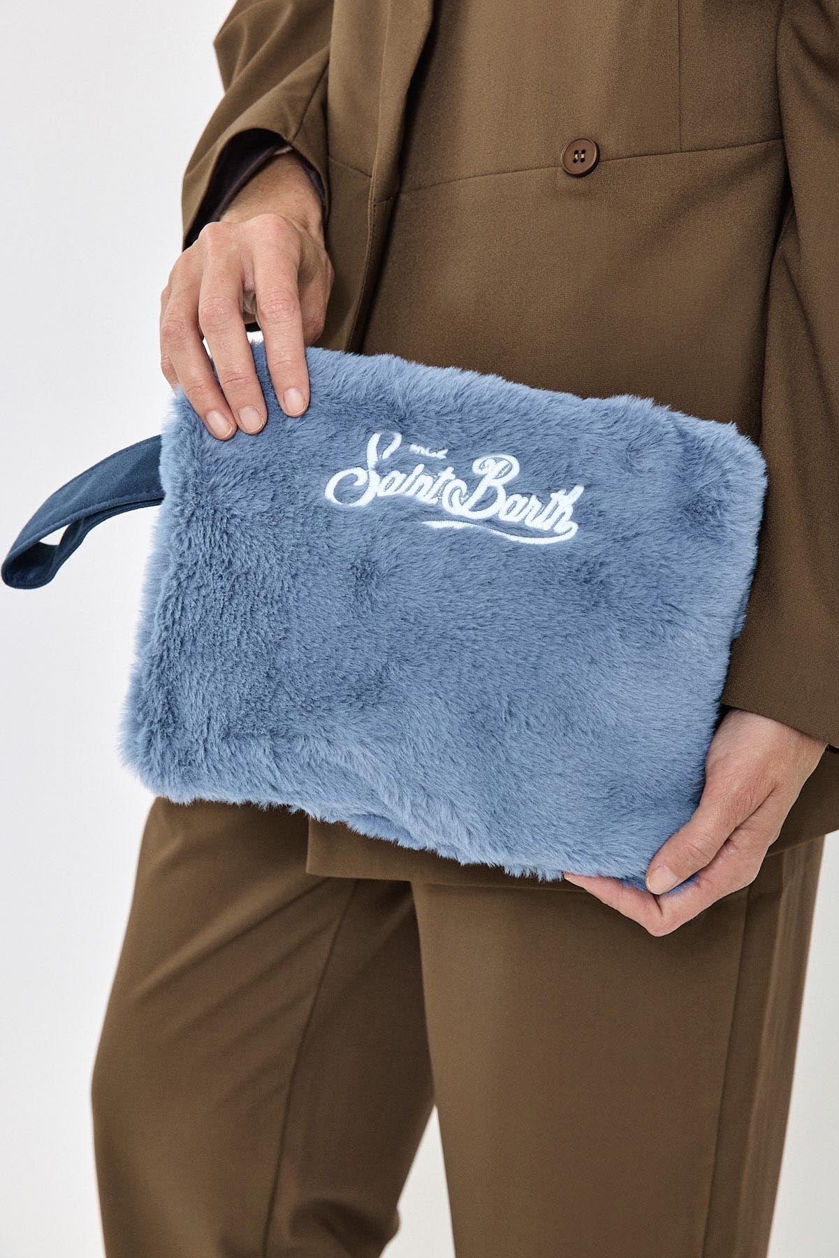 תיק PAREASY בגוון תכלת פרוותי, בעיצוב חורפי ונעים למגע. מבית MC2, התיק כולל כיתוב "Saint Barth" ורצועת יד לנשיאה נוחה. מתאים לנשיאת פריטים קטנים בסטייל ייחודי ומפנק.