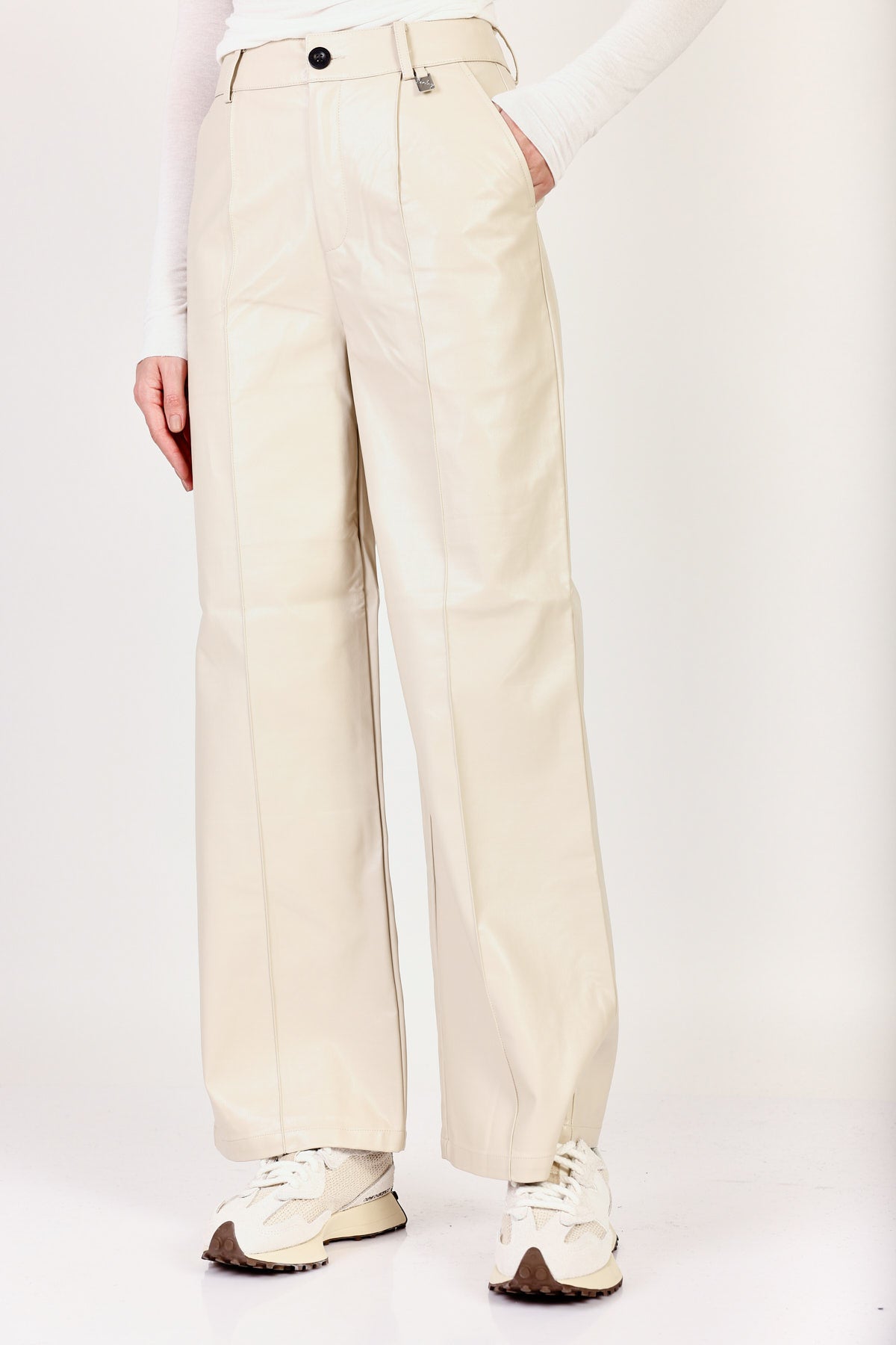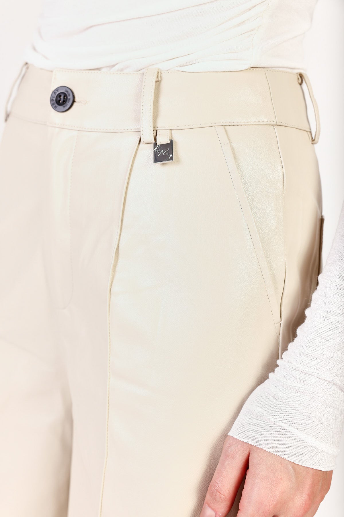 מכנסיים בגזרה גבוהה עם סגירת רכיסה וכפתור. למכנסיים חמישה כיסים.