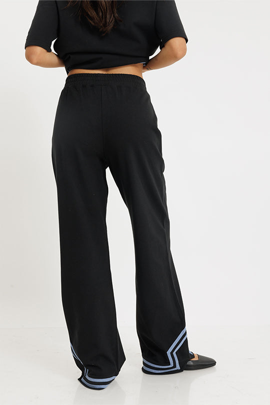 מכנסיים ארוכים לנשים בגוון שחור קלאסי, בגזרה רחבה ומשוחררת, עם פסי גימור תכלת שמוסיפים טאץ' ספורטיבי ואופנתי. עם גומי נוח במותן ומראה מוקפד שמתאים גם ללוק יומיומי וגם לשילוב בסט תואם לסטייל מושלם.