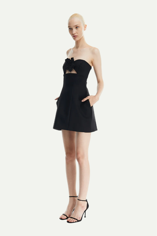 שמלת מיני בגזרת סטרפלס מחמיאה עם חיתוך מתחת לקו החזה ופרח תלת־ממדי במרכז. עשויה מבד מובנה שמעניק מראה נקי ואלגנטי. מתאימה לערב או לאירוע כשאת מחפשת לוק אלגנטי עם טוויסט דרמטי.