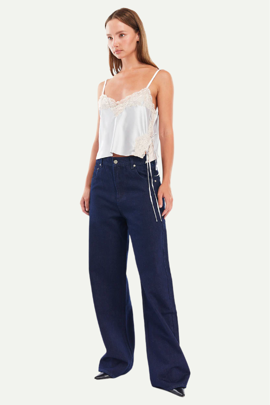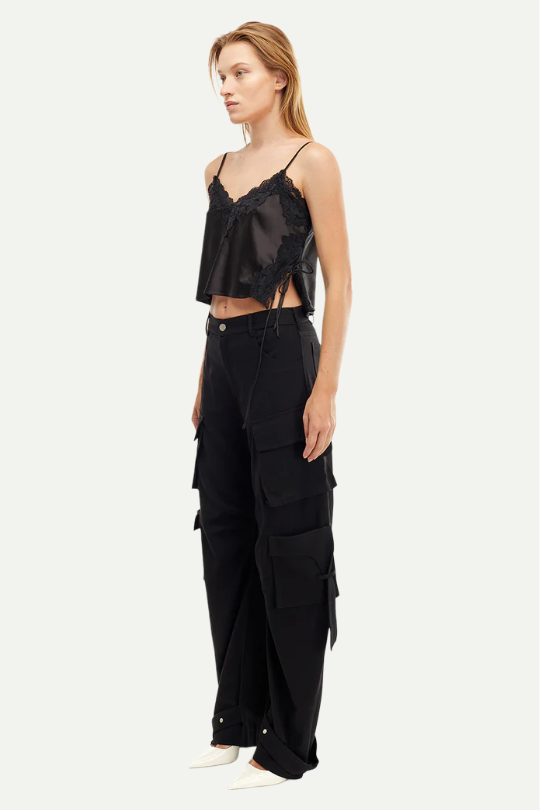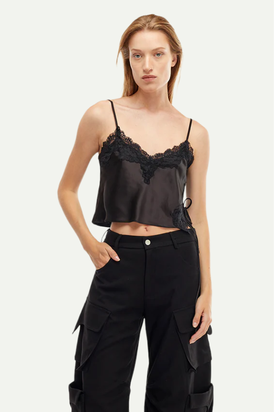 טופ בגזרת קרופ עם כתפיות ספגטי דקות, עשוי בד סאטן מבריק בצבע קרם. שולי המחשוף מעוטרים בתחרה עדינה בגוון טבעי, וקשירה צדדית מוסיפה אלגנטיות ורכות. מושלם לשילוב בלוק ערב או שכבות יום-יום.