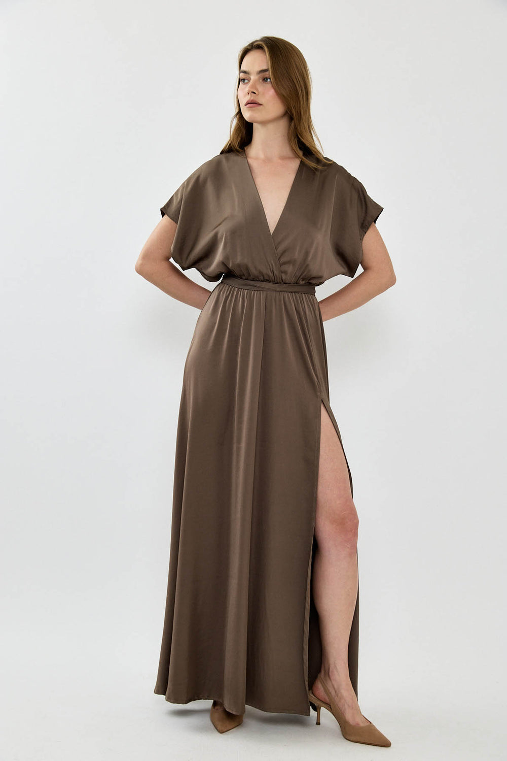 שמלת ערב אלגנטית באורך מקסי בגוון שחור קלאסי. בגזרת מעטפת עם מפתח וי מחמיא וחגורת קשירה מודגשת שמדגישה את המותן. הבד בעל ברק עדין, נעים ונשפך על הגוף. השסע בצד מוסיף טוויסט נשי ומלא נוכחות – מושלמת לאירוע קיץ, חתונה או ערב מיוחד.
