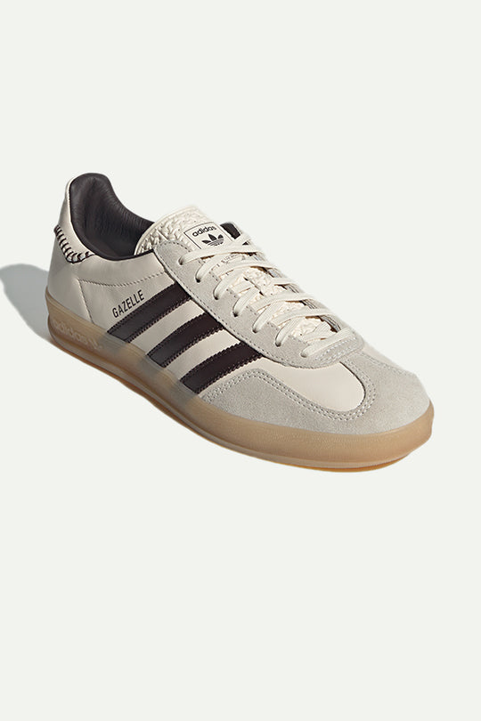 נעלי סניקרס ייחודיות עם עיצוב רטרו-ספורטיבי, בשילוב עליון מעור זמש ועור חלק בגווני אוף ווייט וחום. דגם GAZELLE INDOOR מציע שלישיית פסי צד אייקונית, סוליית גומי שקופה במראה וינטג' ונוחות מקסימלית ליום-יום. מתאים לשדרוג כל לוק עם נגיעה אלגנטית ולא מתאמץ.