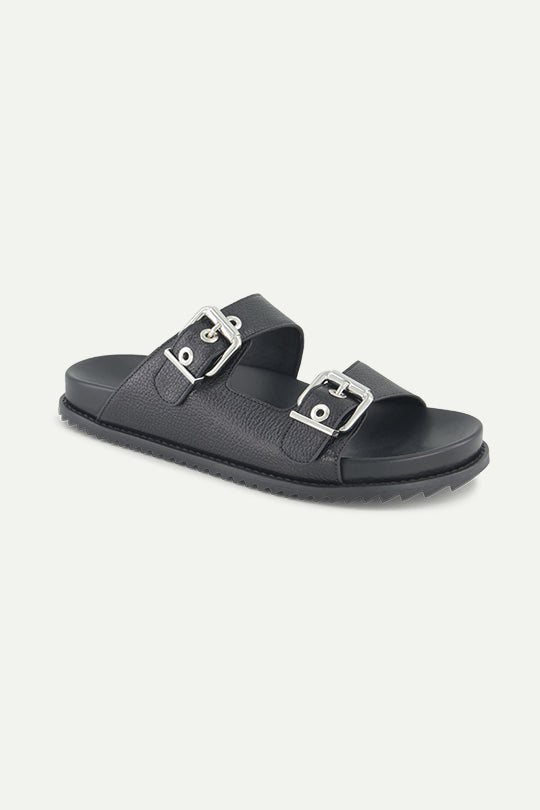 כפכפי רצועות היסטרים בסגנון אלגנטי אפורטלס. לכפכפים רצועות עור ואבזמים זהובים המוסיפים שיק. מדובר בנעליים מתוך הקולקציה החדשה של רזילי סטודיו, שילוב של נוחות וסטייל.