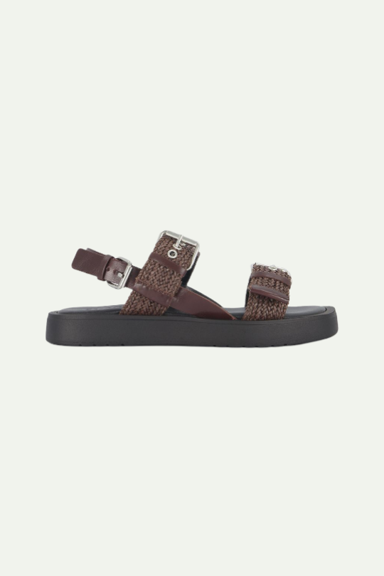 סנדלים שטוחים בגוון חום מבית RAZILI STUDIO עם רצועות קלועות בסגנון אתני ואבזמים כסופים.