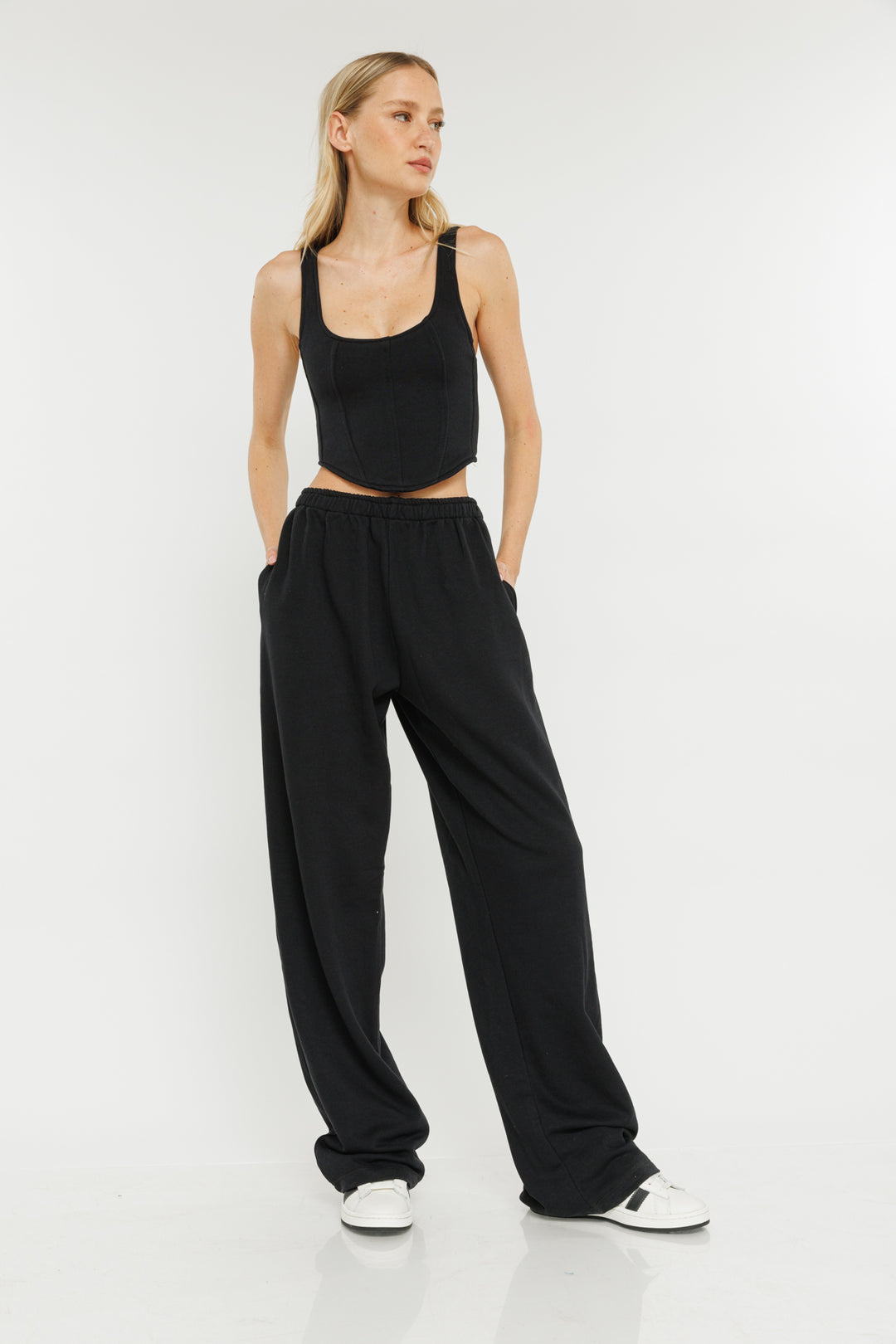 הקולבריישן של עמית פיליפ ורזילי סוף סוף כאן והוא כולל את כל הפריטים הכי סטייל לעונה הקרובה. חשוב שתדעי שלא יהיה לך קל לבחור אבל אנחנו פה בשבילך ולעזרתך, מוזמנת להתייעץ. מכנסי טרנינג היסטירים בגזרה רחבה ומשוחררת. למכנסיים מותן אלסטית והן עשויות מבד פרנץ' טרי דקיק. השלימי את הלוק עם מחוך אלי תואם או עם טי שירט לבנה.