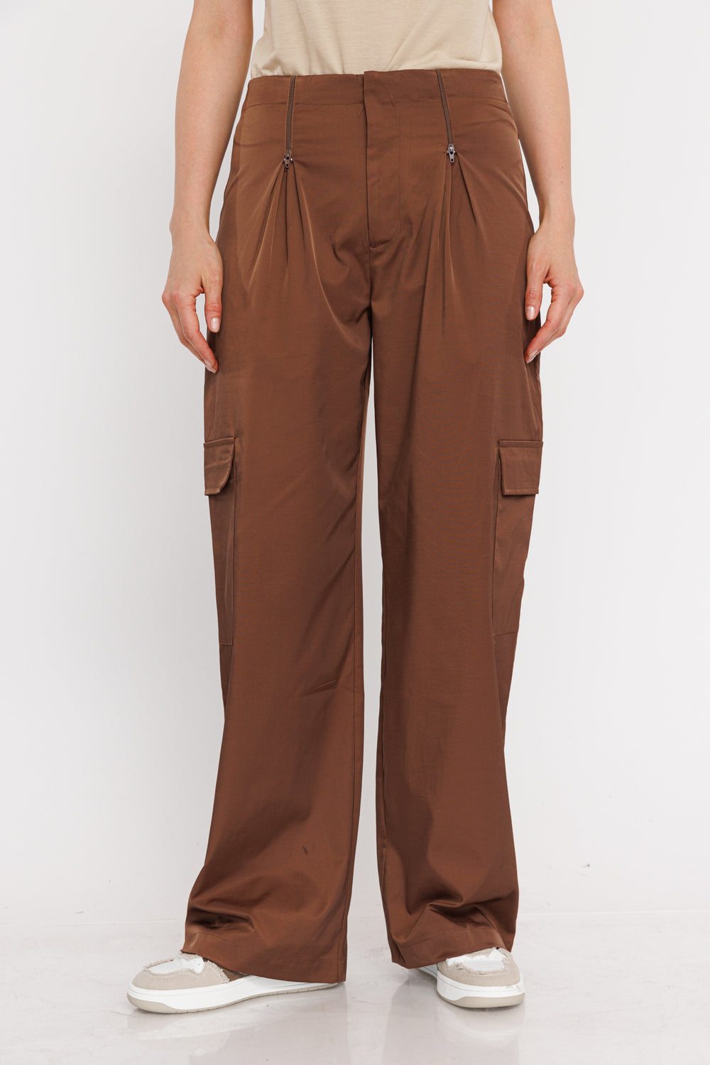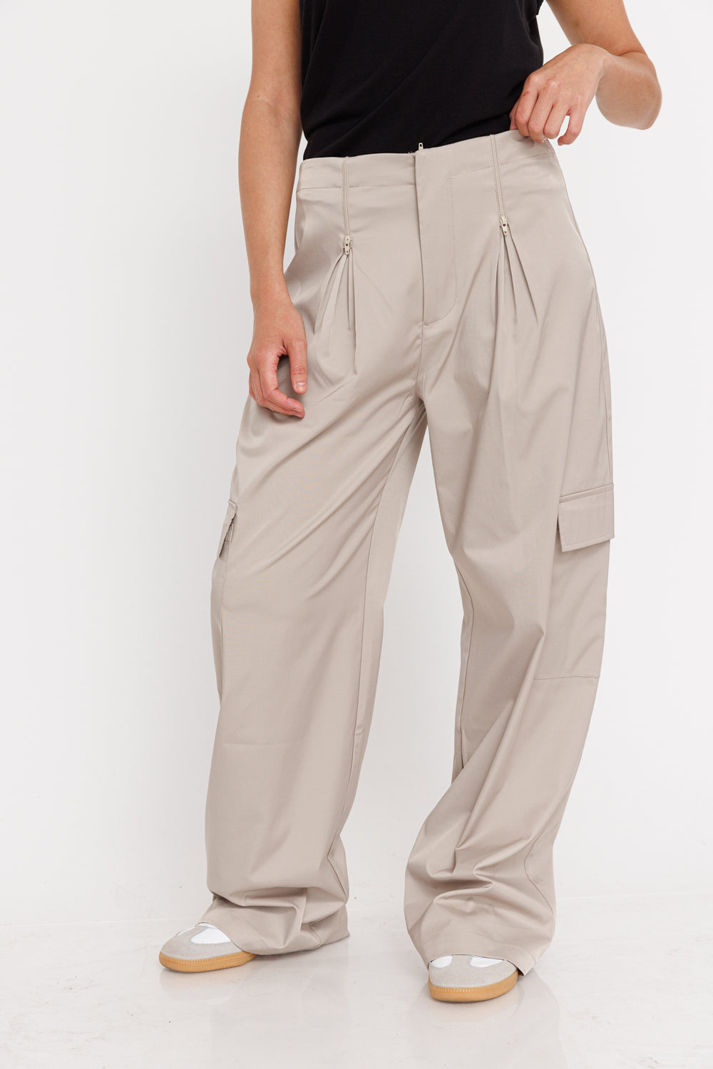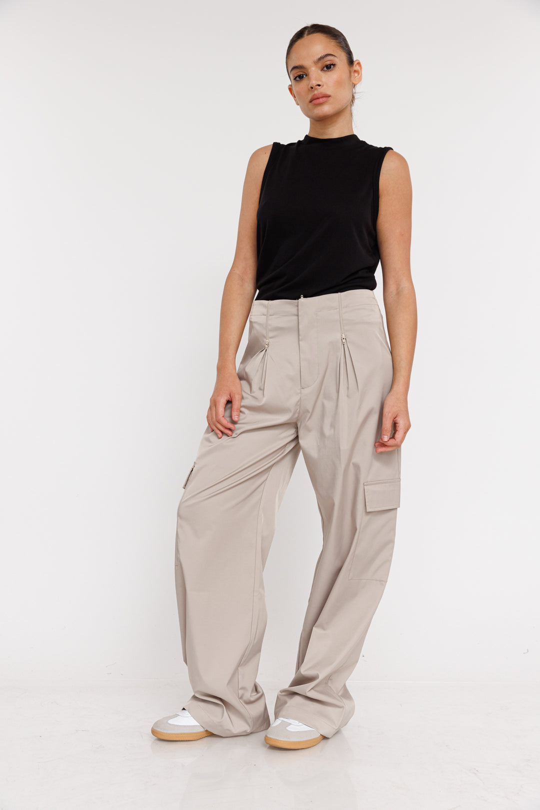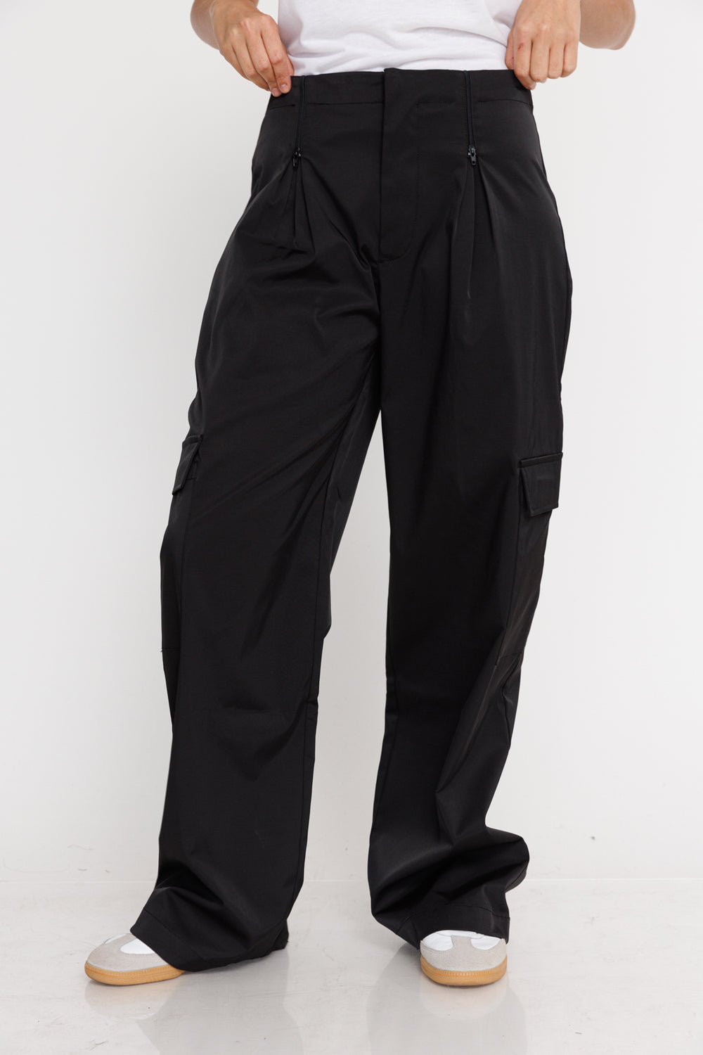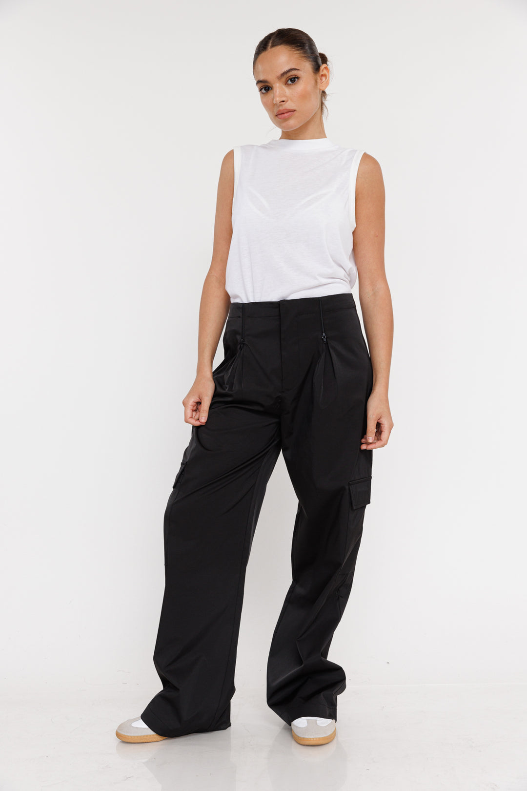 למכנסי אטלס גזרת רגל רחבה עם כיסים בסגנון דגמ"ח ורוכסנים במקום מתפרים היוצרים פיט מושלם לגוף. השלימי את הלוק עם חולצת בייסיק קלאסית, כובע מצחייה ועגילי חישוק גדולים.