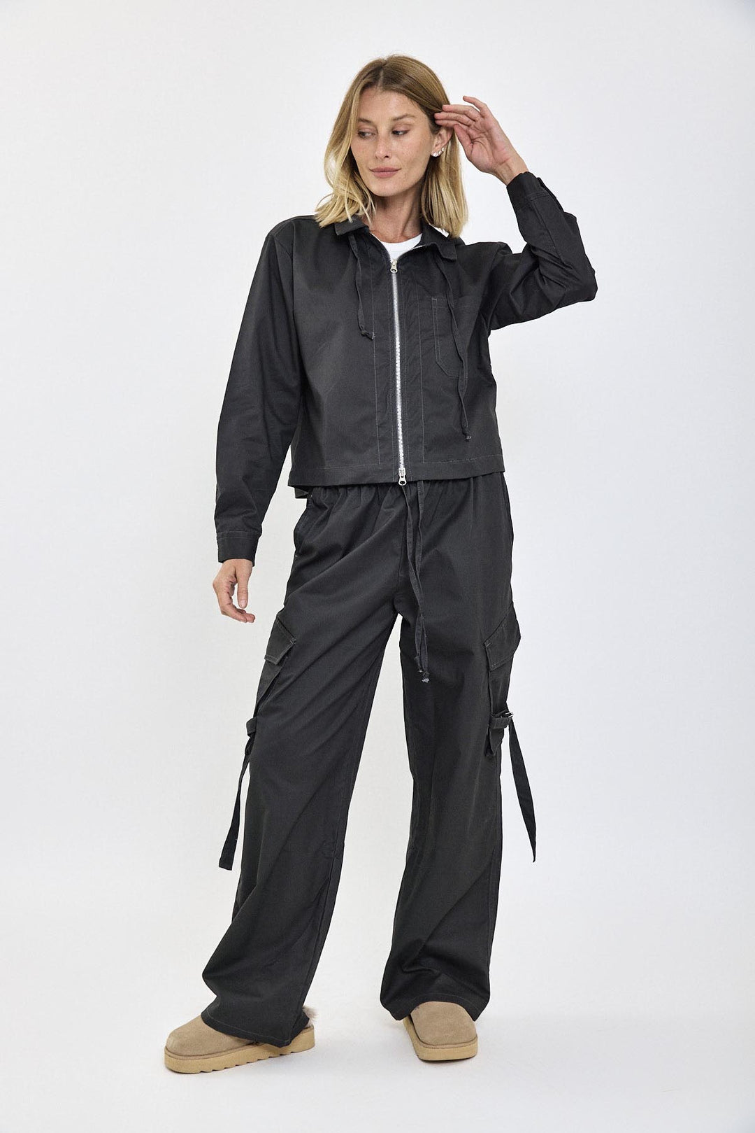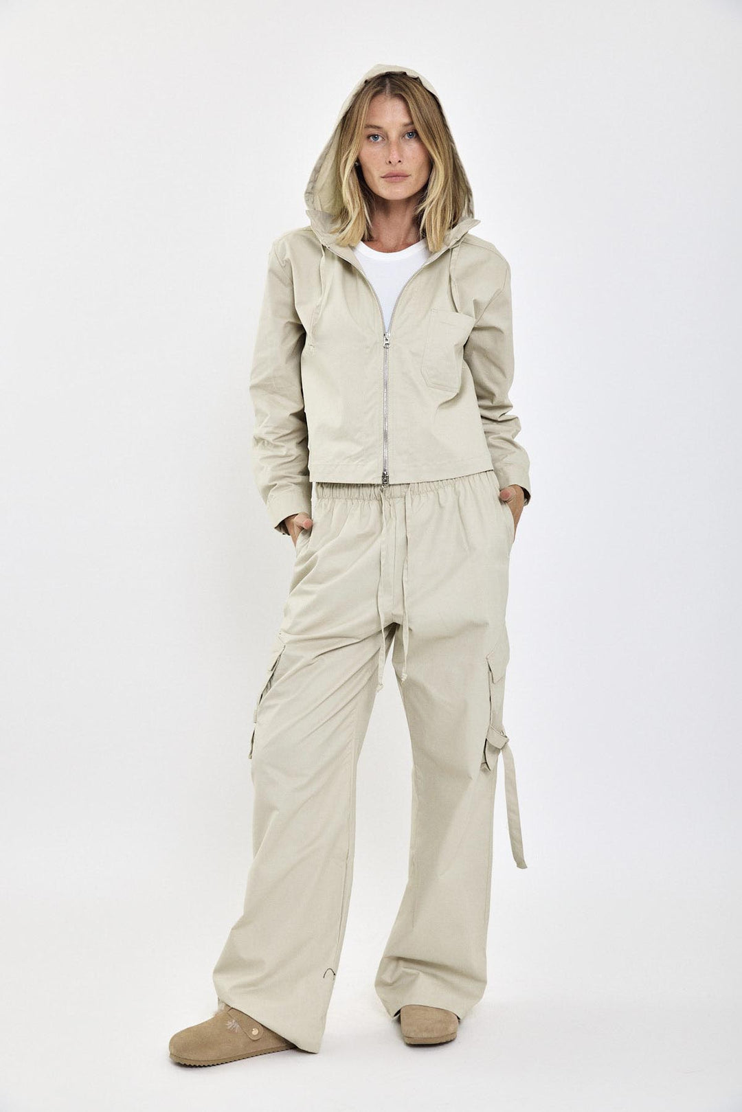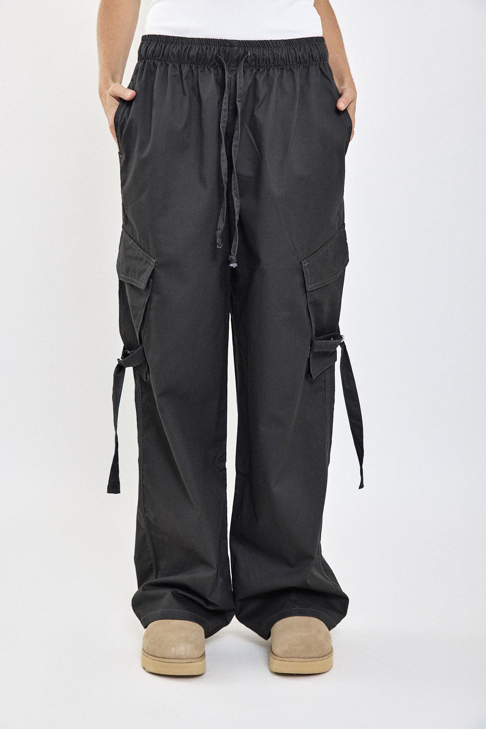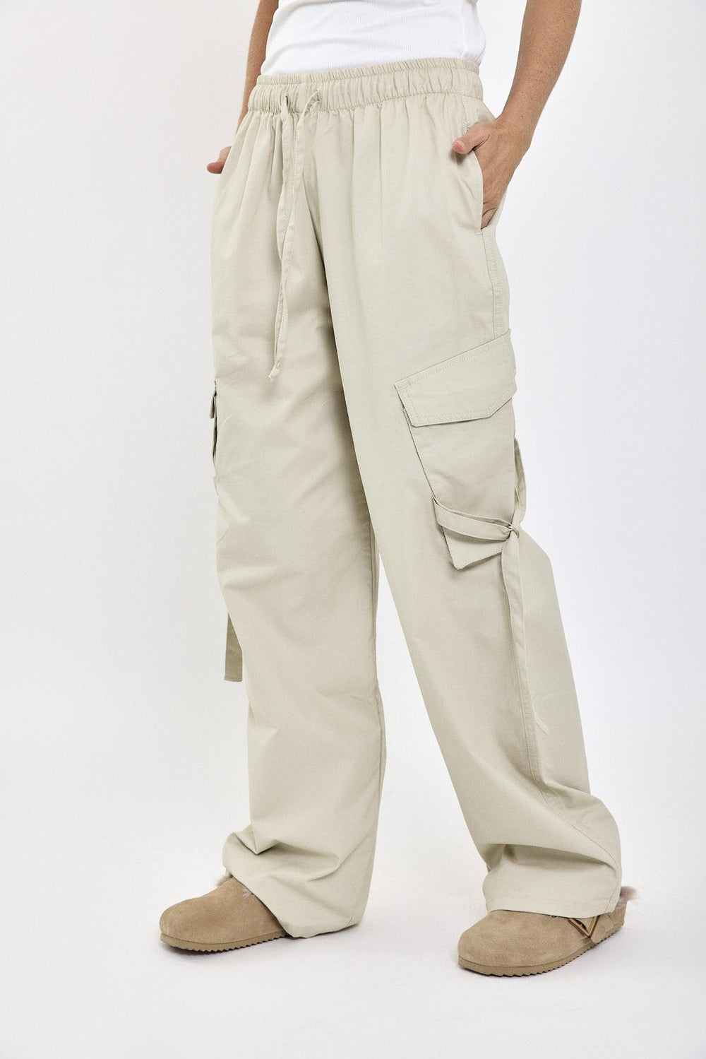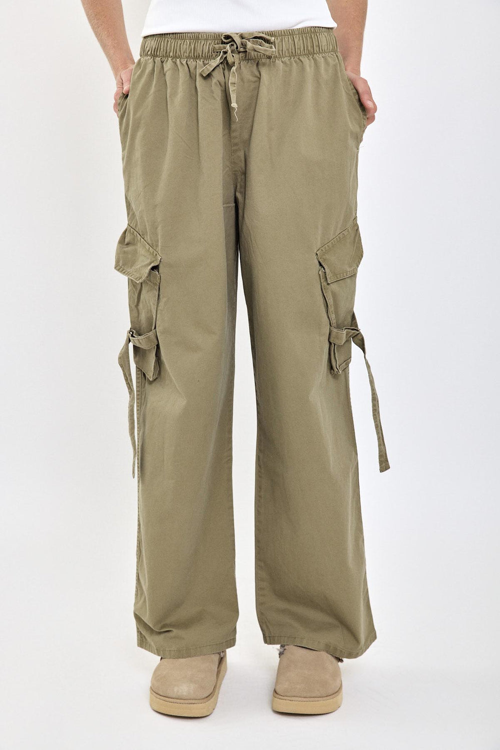 מכנסי קארגו בעיצוב רחב מבית Razili Studio בצבע ירוק זית. המכנסיים מגיעים עם כיסים צדדיים ושתי רצועות קשירה להשלמת המראה הקז'ואלי. נוחים לשימוש יומיומי ומוסיפים סטייל טבעי לכל הופעה